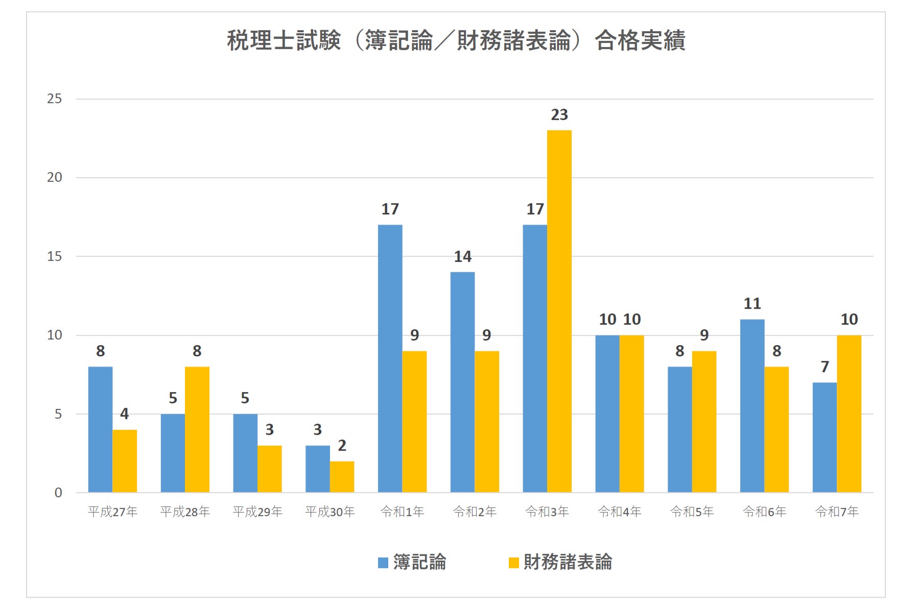 公認会計士試験と同様に難関国家試験とされる税理士試験においても、本学では多数の実績を残しています。令和7年11月28日に発表された「令和7年度第75回税理士試験」では、簿記論7名、財務諸表論10名が合格し、過去11年間累計で簿記論108名、財務諸表論95名の合格者を輩出となりました。