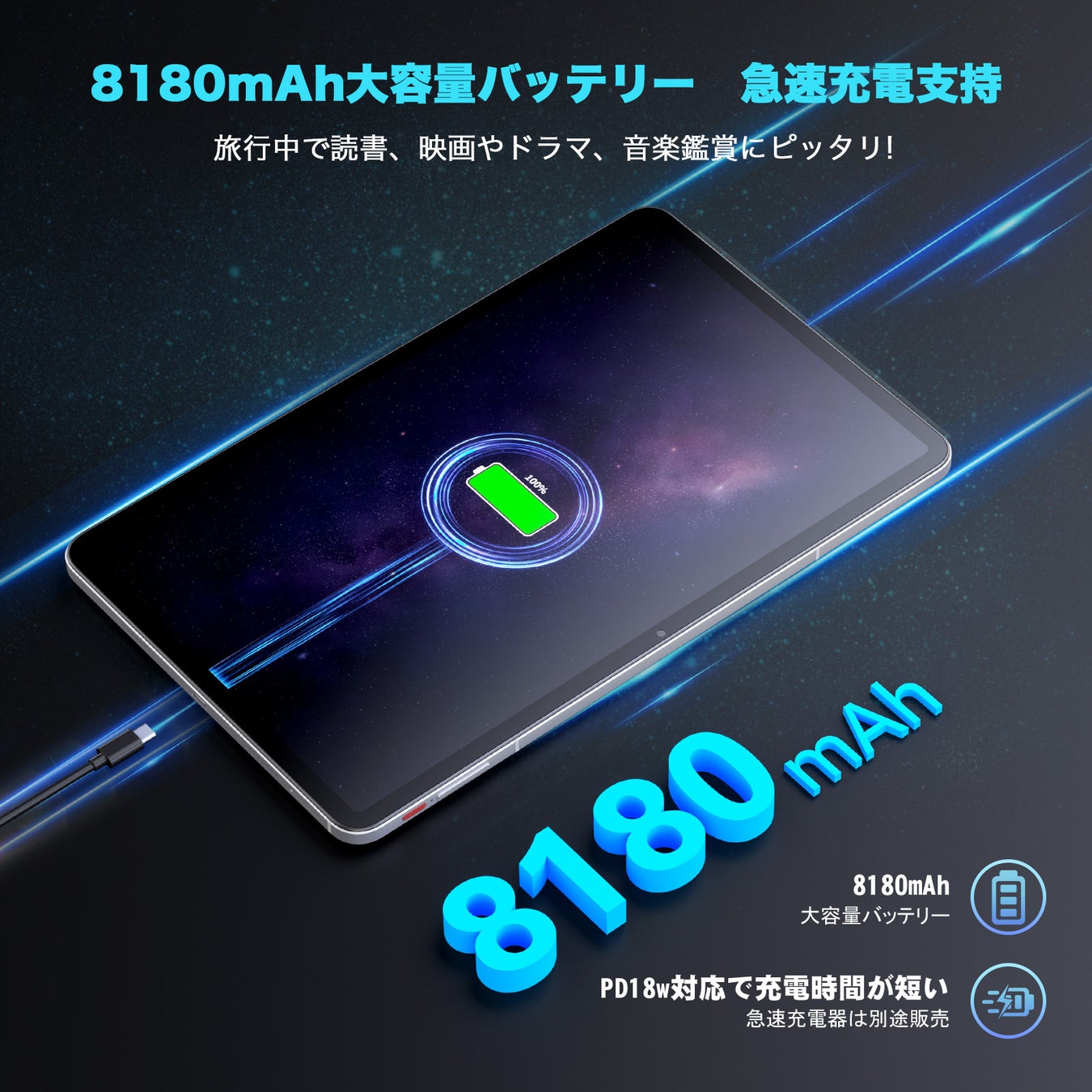 AvidPadタブレットA90は8180mAhの大容量バッテリーを搭載しており、長時間の使用でも安心です、PD18W急速充電にも対応しており、急な外出先でも充電がスムーズに行えます。さらに、光センサーを搭載しており、明るさを自動に調整できて目を保護できます。重力センサー、ジャイロセンサ搭載より良いゲーム体験を提供します。