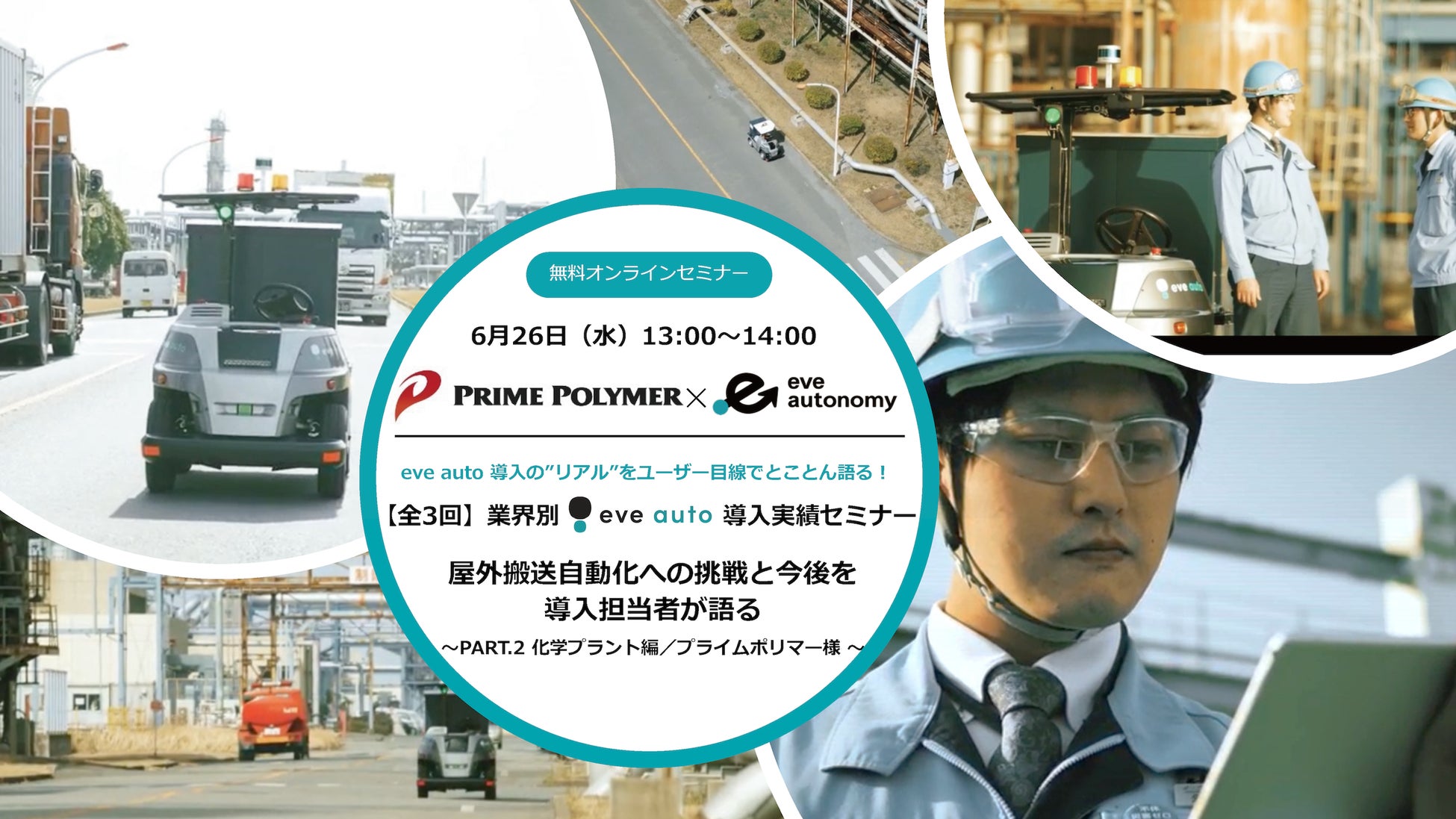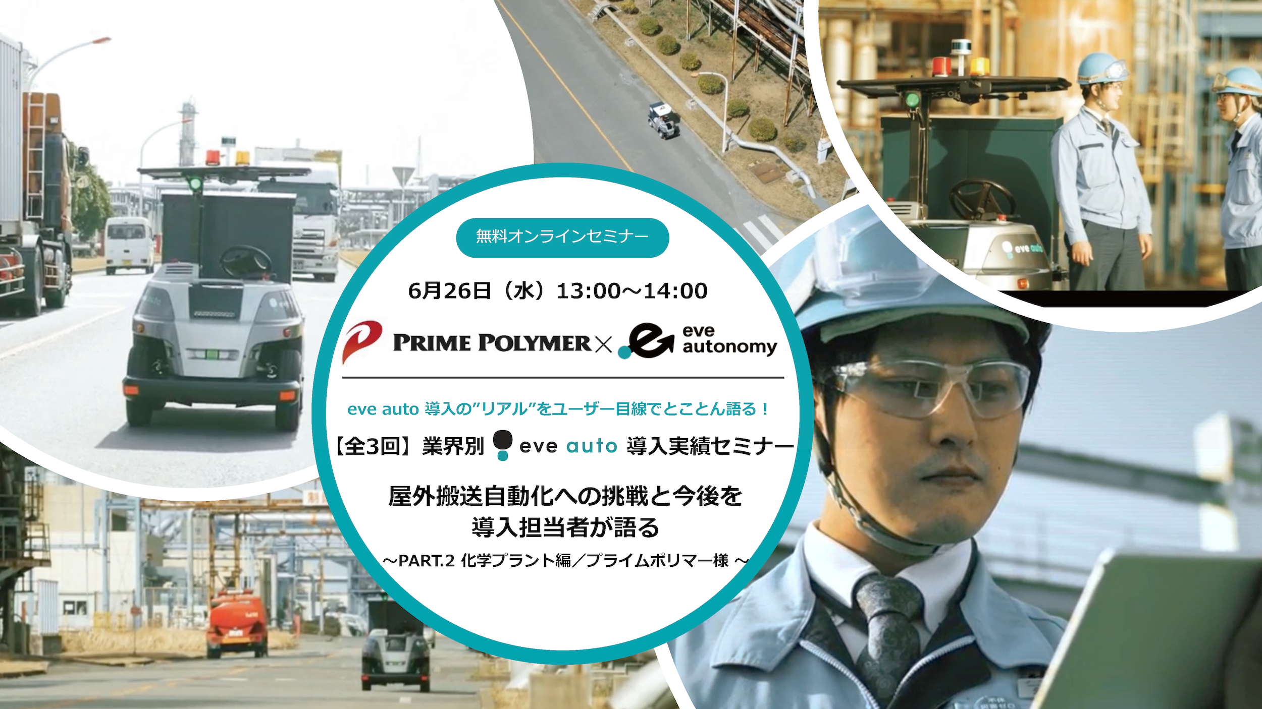 株式会社eve autonomy(イブ・オートノミー、静岡県磐田市、代表取締役:星野 亮介、以下「eve autonomy」)は、2024年6月26日 (水)に、第4回の自主開催となる無料オンラインセミナー「【全3回】業界別 eve auto 導入実績セミナー:各業界の屋外搬送自動化への挑戦 〜PART.2 化学プラント編/プライムポリマー 様 〜」をeve autoサービスのユーザー企業である株式会社プライムポリマーの導入ご担当者様を招いて開催いたします。