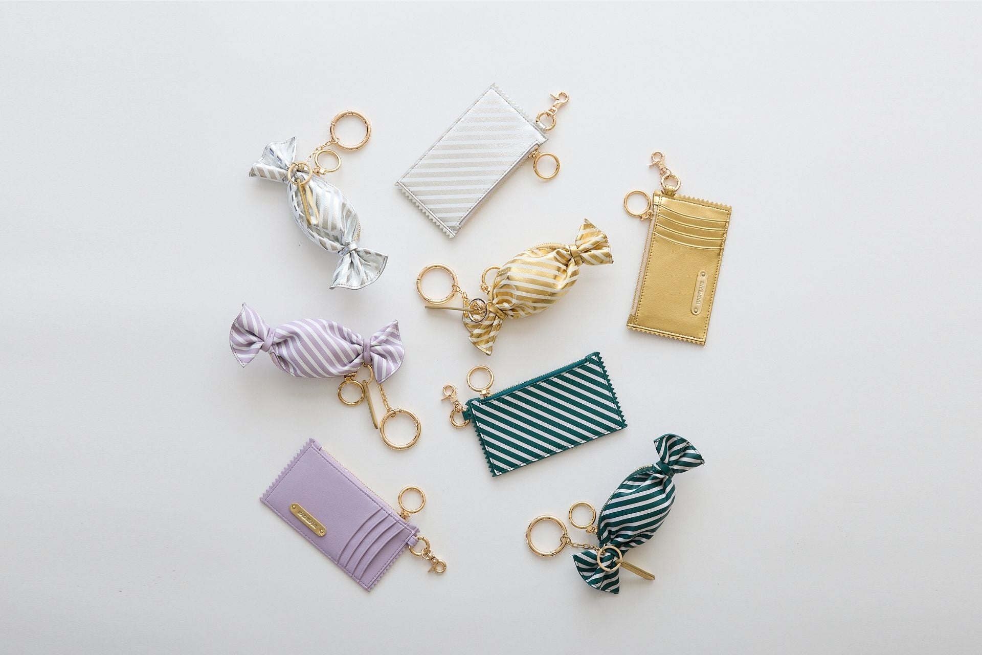 包みキャンディのようなフォルムが印象的なキーチャームとカードケース。