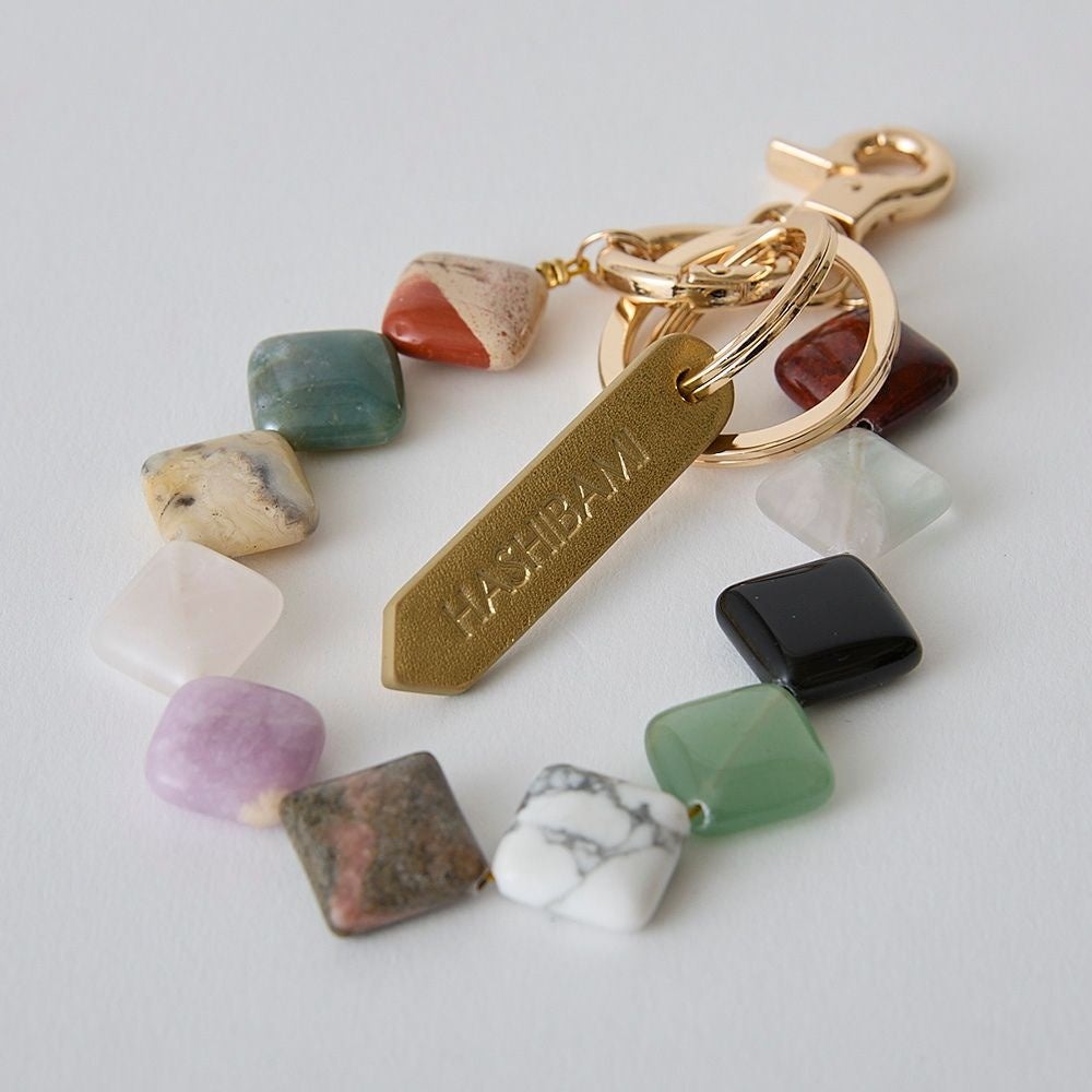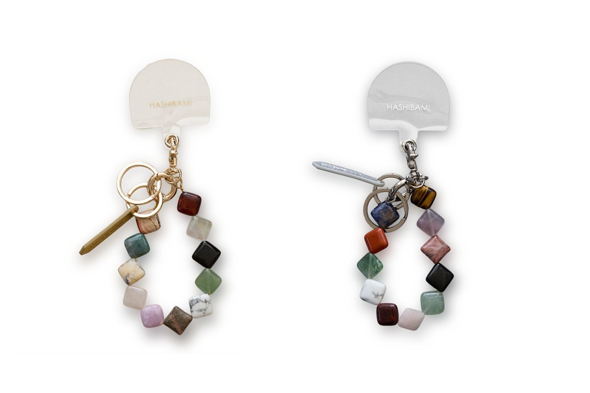 スクエアカットの天然石を連ねた、アクセサリー感覚で使えるストラップ。