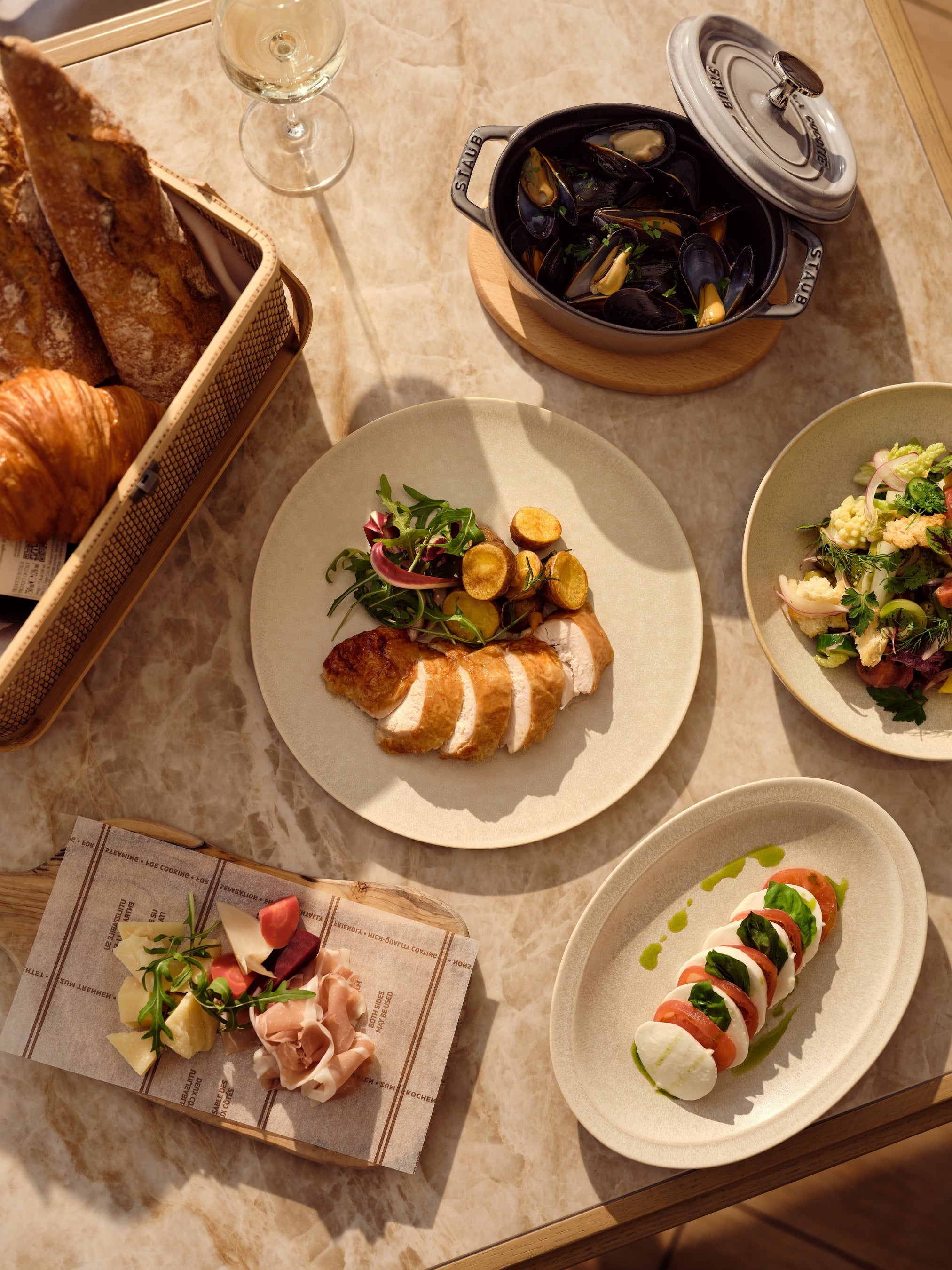 セットのお料理は、国産生ハムとパルメザン、ムール貝の白ワイン蒸し、パンツァネッラ、カプレーゼなどのアペタイザーから、2種類のサンドイッチ、そしてメインの岩手県産奥州いわいどりのグリルまで、シェアスタイルで楽しめる7品を取り揃えています。視覚も味覚も喜ぶ、太陽の恵みをそのまま閉じ込めたようなイタリアのトラディショナルなサラダ、パンツァネッラは、旬の新鮮野菜に大きめにカットしたフォカッチャのクルトンが絶妙にマッチした一皿で、ホワイトバルサミコを効かせた甘酸っぱいドレッシングとレモンで仕上げた爽やかな味わいが魅力です。イタリアンビールやワインのフリーフロードリンクとともに、満足感たっぷりの内容でお届けいたします。