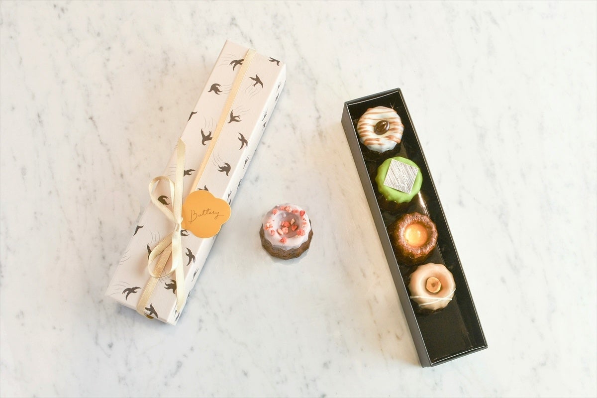 店内のオーブンで焼き上げたカヌレは、外はカリッと、中はもっちりとした独特の食感と、北海道バターの味わいが特長です。そのカヌレを贅沢に5種類アソートした『ホワイトデーカヌレボックス』を、3月1日(土)~3月16日(日)の期間限定で提供します。キャラメルチョコとヘーゼルナッツが香ばしい「キャラメルカヌレ」に、フリーズドライストロベリーが春らしい「苺カヌレ」、ラム酒が香る「プレーンカヌレ」、生地に抹茶リキュールをあわせた「抹茶」、チョコレートのデコレーションがキュートな「コーヒー」を詰め合わせました。