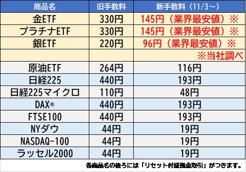 AIゴールド証券株式会社(本社:東京都中央区日本橋久松町12-8、代表取締役:辻村武之)は、2025年11月3日より,東京金融取引所における取引所CFD「くりっく株365」における取引手数料を全面的に見直し、人気のコモディティETFをはじめとする主要銘柄において、大幅な引き下げを実施しました。