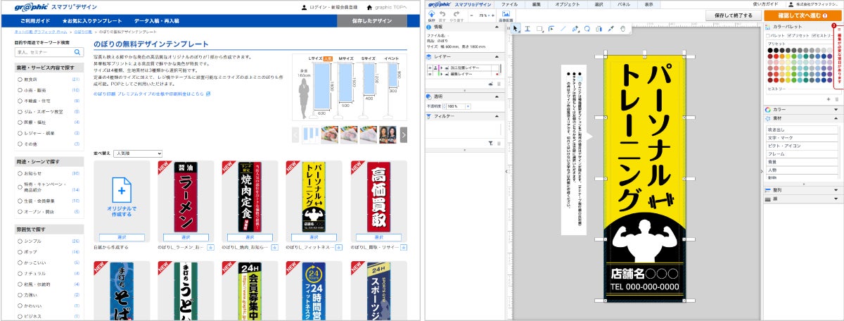 株式会社グラフィック(本社:京都市伏見区、代表取締役社長:西野能央、以下「当社」)はネット印刷事業にて、印刷物のデザインをWeb上で作成できるサービス「スマプリ®デザイン」に「のぼり」を追加しました。あらかじめデザインされたテンプレートを使って、販促用のぼりを簡単に作成いただけます。