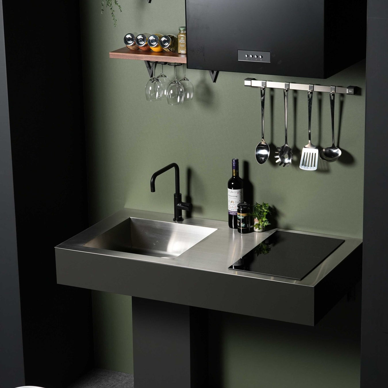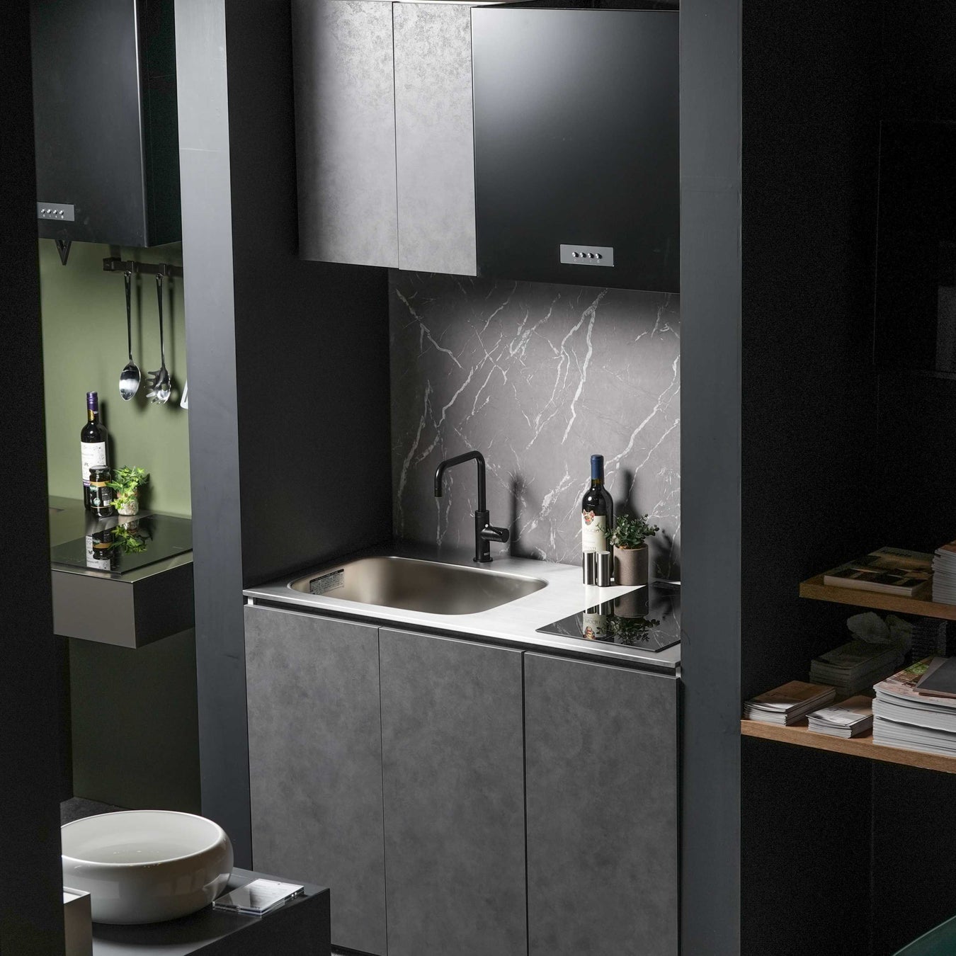 トレンドのモルタル調を取り入れた新作ミニキッチン『モルシーナ』も展示。奥行き450mmを選択でき、限られた空間をスタイリッシュに演出するミニマルなデザインが特徴です。