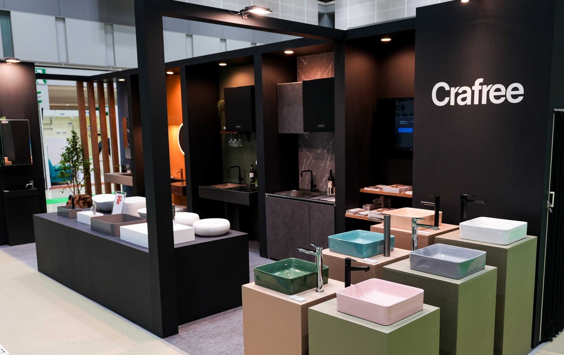 Crafreeは「あなたの暮らしに、非日常の空間を」をコンセプトに、洗面台・洗面ボウル・ミニキッチンをはじめとする住宅設備機器を提案しています。今回の出展では、単に“見る展示”ではなく、質感や素材を“確かめる展示”として体験価値を重視した構成を行いました。