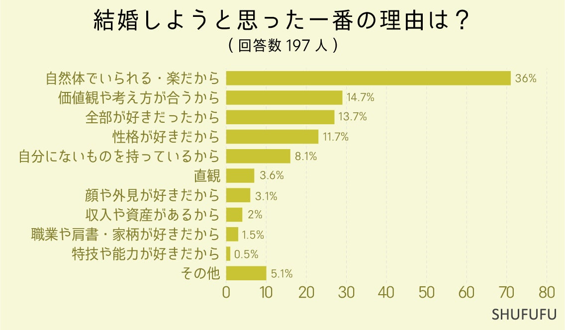結婚しようと思った一番の理由に関しては1位「自然体でいられる・楽だから(36%)」、2位「価値観や考え方が合うから(14.7%)」でした。巷では収入や容姿が結婚条件として取り沙汰されますが、それよりも自分が一緒にいて心地よいかが結婚の決め手になることのほうが多いようです。