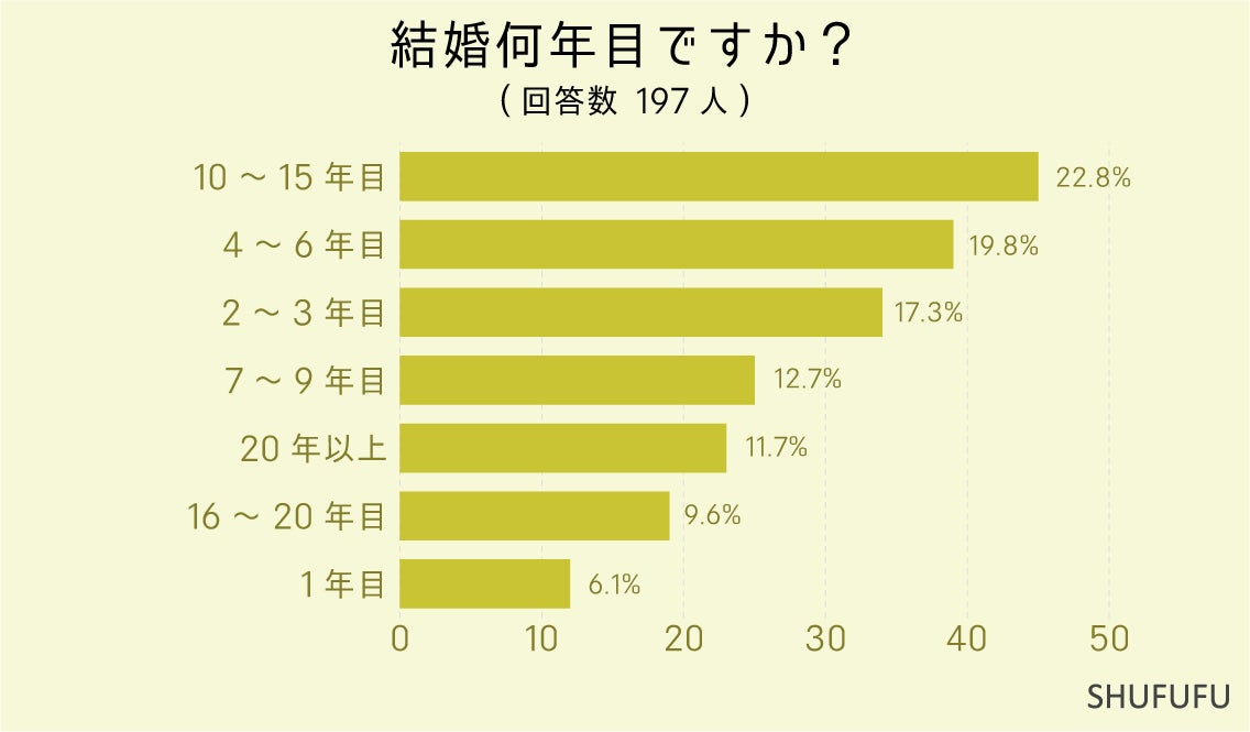 結婚何年目ですか?の問いに対して最も多かったのが「10~15年目(22.8%)」でした。 次いで「4~6年目(19.8%)」「2~3年目(17.3%)」という結果でした。 今回のアンケート調査では新婚の方の回答は少なめでした。