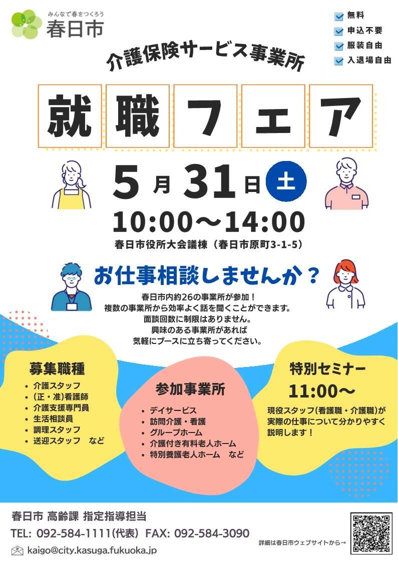 春日市内の介護保険サービス事業所・高齢者施設などで働くことを考えている人のために、就職フェア(合同面接会)を開催します。