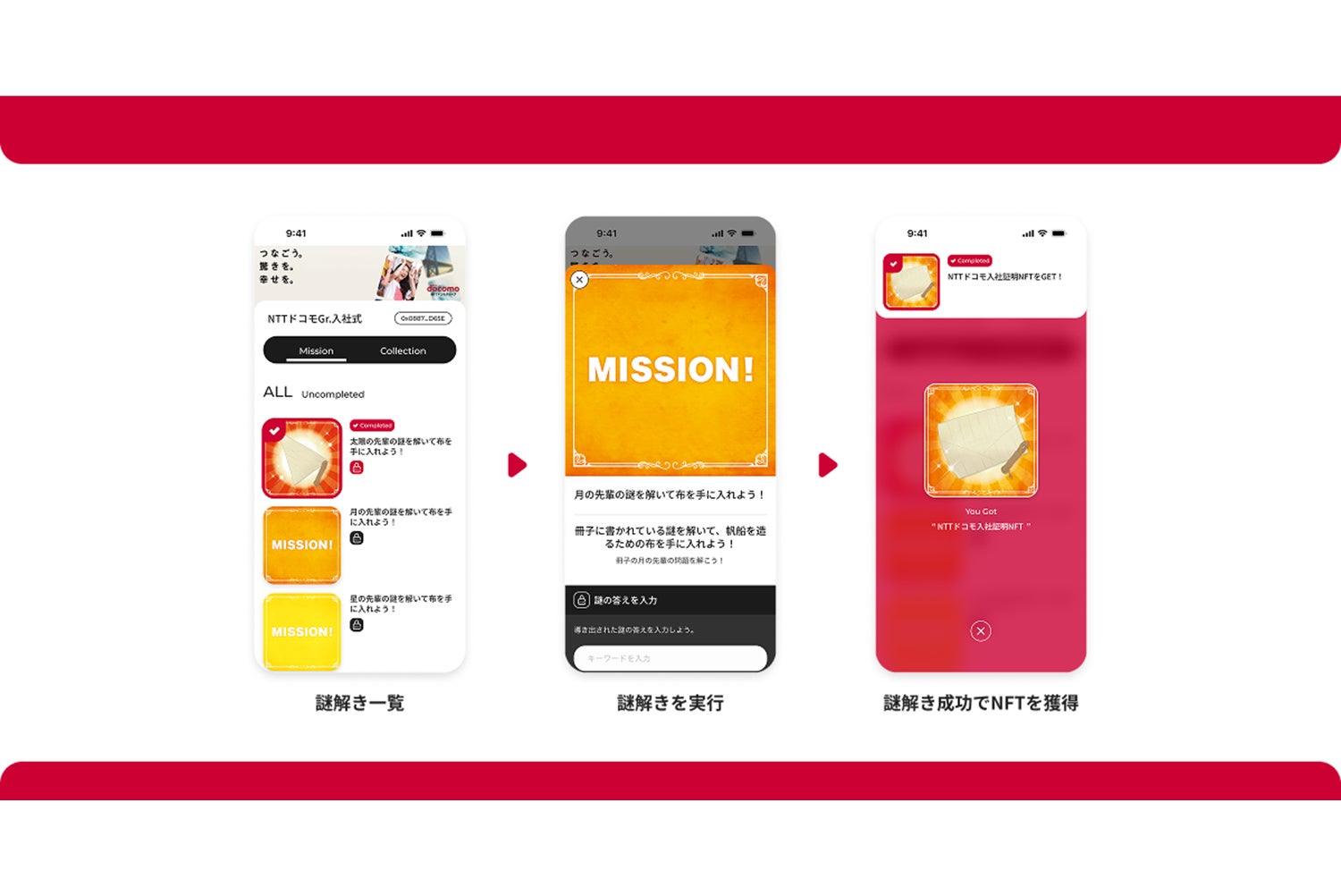 入社式内のコンテンツとして、NFT(SBT)を活用した謎解きゲームが実施されました。新入社員がチームで協力しながら会場内に隠されたミッションをクリアし、NTTドコモグループのブランドスローガンや行動原則を学ぶコンテンツであり、ゲーム内においてはNFTが謎解きの鍵として使われたほか、報酬獲得の演出としても活用されました。
