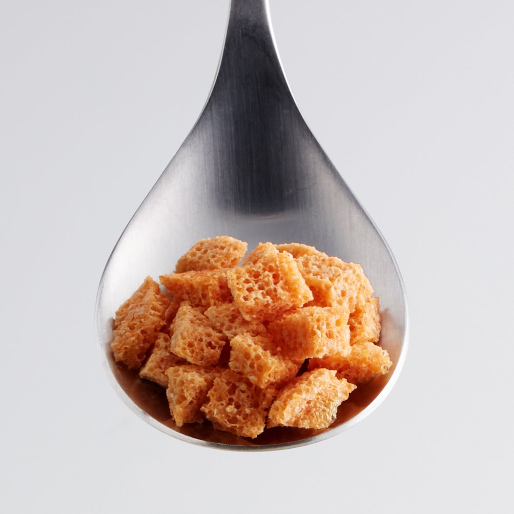 明太子の粒や調味液をフリーズドライ加工しキューブ状にしたもので、液体の中でも崩れずに浮きあがります。スープの底に沈まないため、クルトンのように使えます。最初はサクサク、水分を含むとプルプルとした食感を楽しめます。