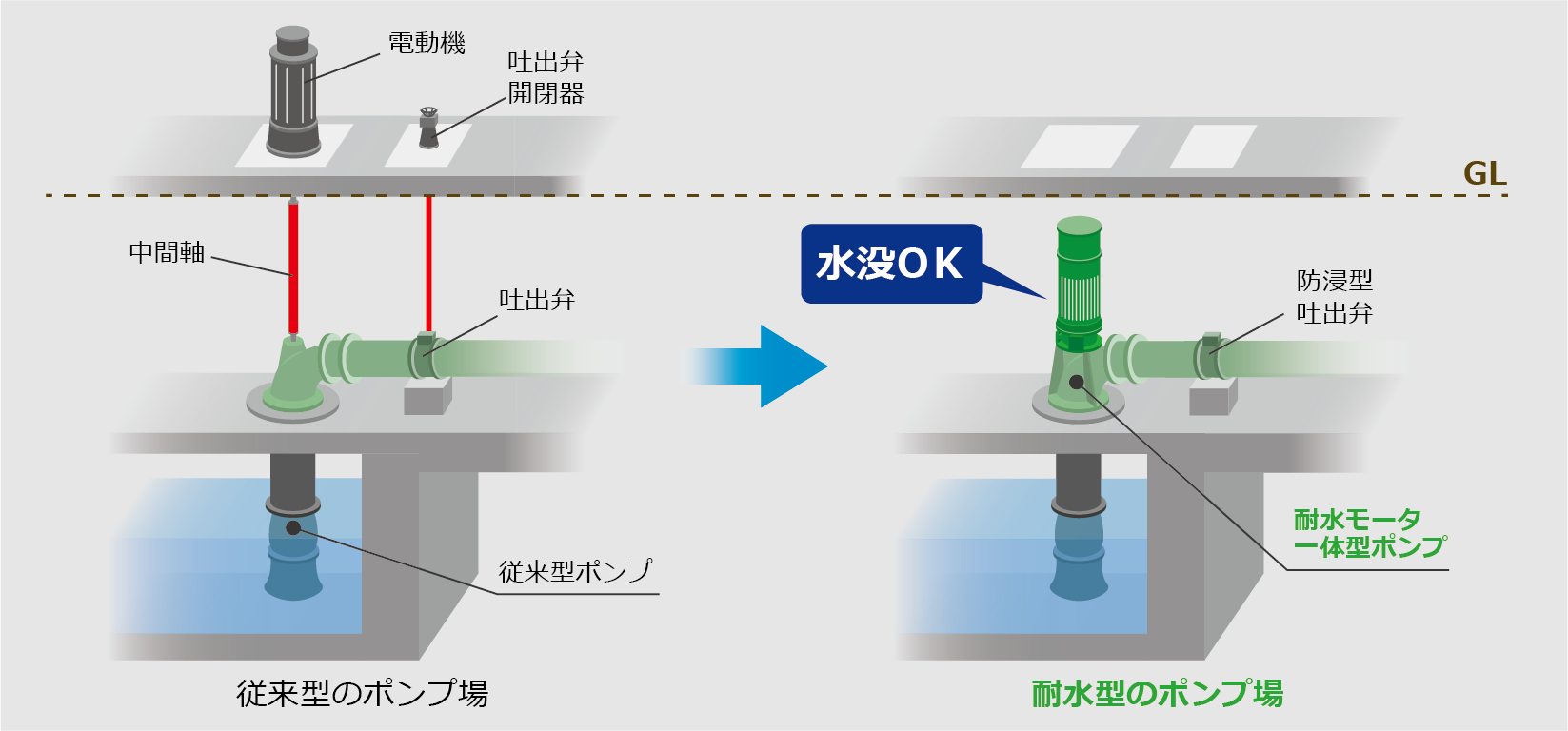 従来のポンプ設備は、ひとたび水没すると復旧に多額の費用と数ヶ月の時間を要し、その間の排水機能喪失が地域社会に深刻な二次被害をもたらすことが課題でした。