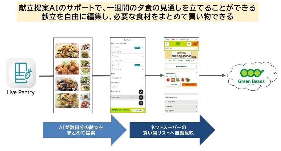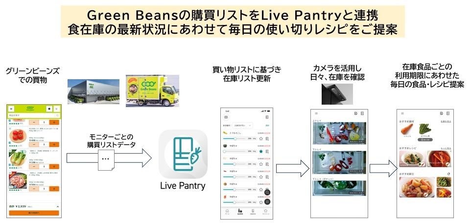 グリーンビーンズでは1週間鮮度保証の野菜「鮮度+」や、届いたその日から食べごろを期間保証する果物「食べごろ+」などを提供し、これらの商品やサービスを通じてまとめ買いを提案します。パナソニック製の冷蔵庫AIカメラと、実証向けに一部機能を追加したパナソニック製冷蔵庫用アプリLive Pantryを活用して、鮮度を保持しつつ、カメラ画像からAIが野菜を自動認識し、日持ち目安に応じて先に消費した方が良い野菜と、その野菜を使ったレシピをお勧めします。