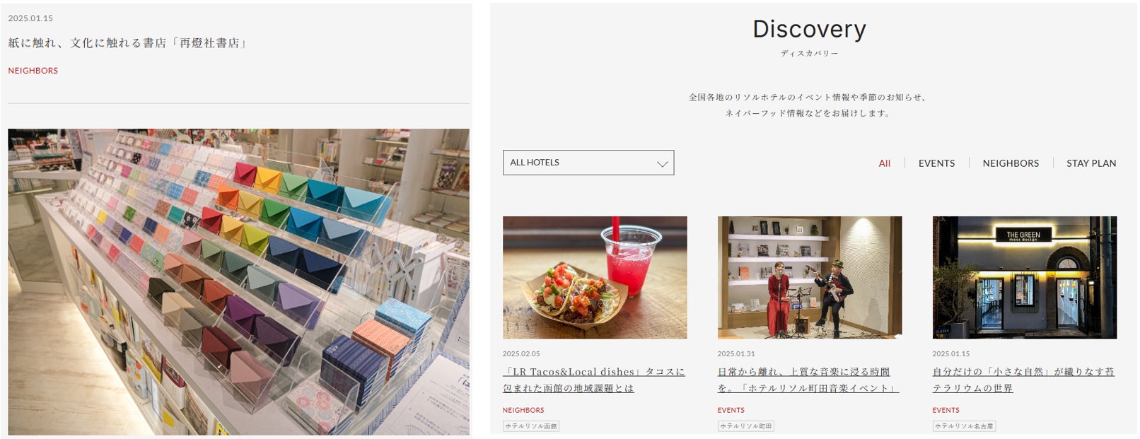 ブランドサイトでは、全国各地のリソルホテルの情報だけでなく季節ごとの魅力的な街の表情を現地ホテルから届ける オウンドコンテンツ「Discovery」を提供し、全国各地から集まる「物語」が、皆さまを旅へと誘います。