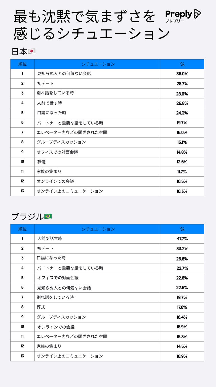 人は、どんな時に沈黙になることを最も恐れているのでしょうか?今回は日本と、先ほどのランキングで最も「沈黙に耐えられない」という結果になったブラジルを比較していきます。