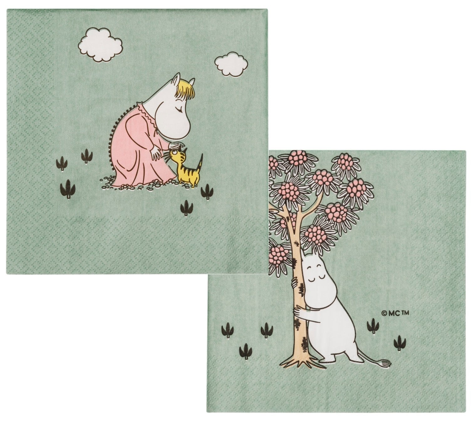 コレクションのメインカラーには、セージグリーンと淡いピンクを採用。木を抱きしめるムーミンや、猫をなでるスノークのおじょうさんなど、やさしさあふれるモチーフが「Loving Care」の世界観をやわらかに表現しています。