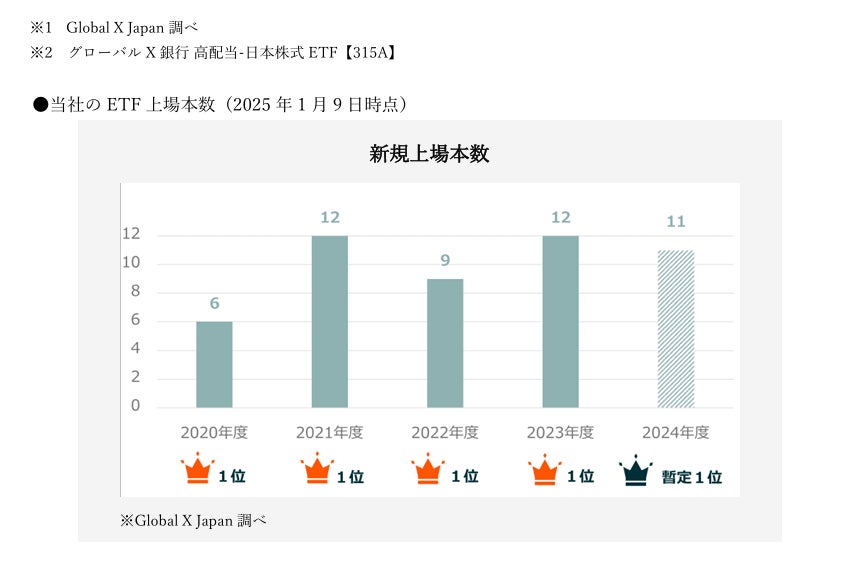 大和証券グループのGlobal X Japan株式会社(東京都千代田区、代表取締役社長 姜 昇浩。以下「当社」)は、2025年1月9日に新たにETF1銘柄※2を東京証券取引所に上場し、当社が設定・運用するETFが50本に到達したことをお知らせします。