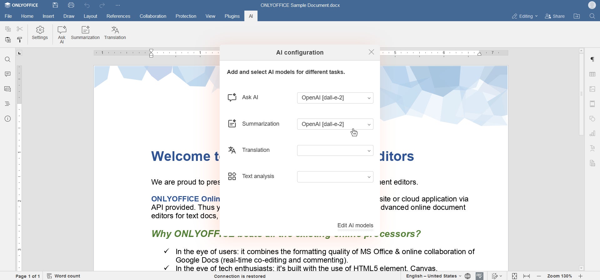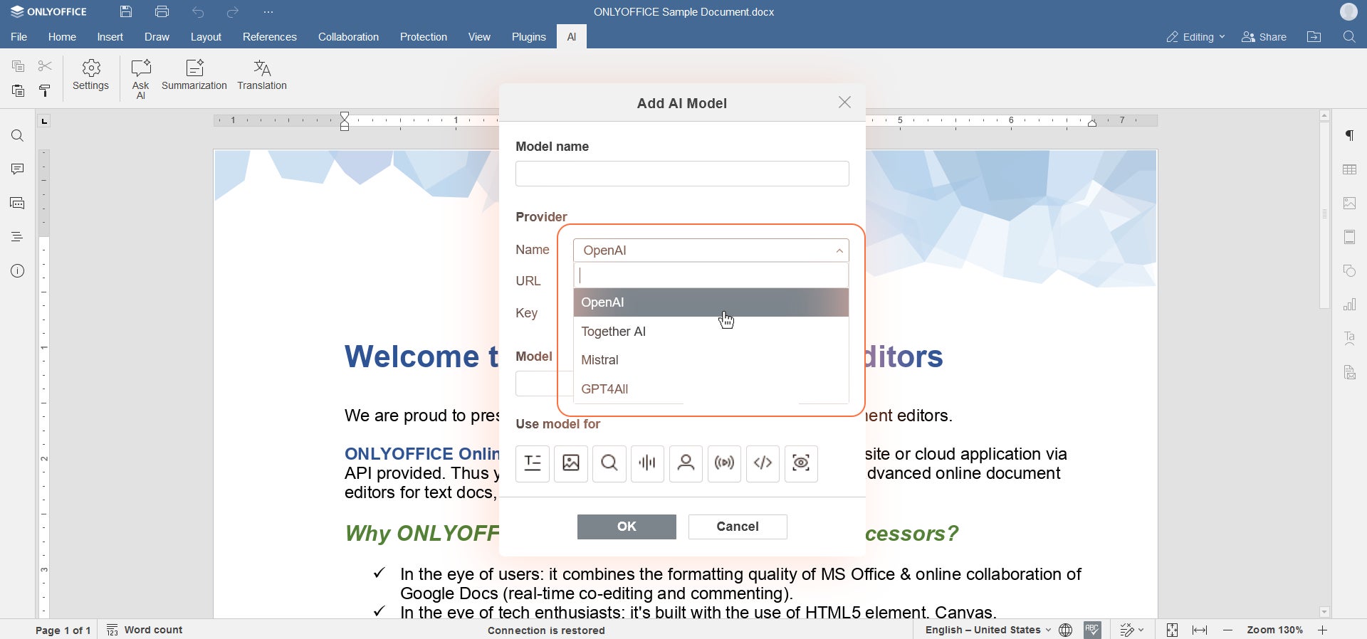 今後、ONLYOFFICE DocsでAIアシスタントを利用できるのはChatGPTプラグインに限りません。私たちはこの点を再考し、より柔軟に任意のAIアシスタントを接続する機能を追加しました。