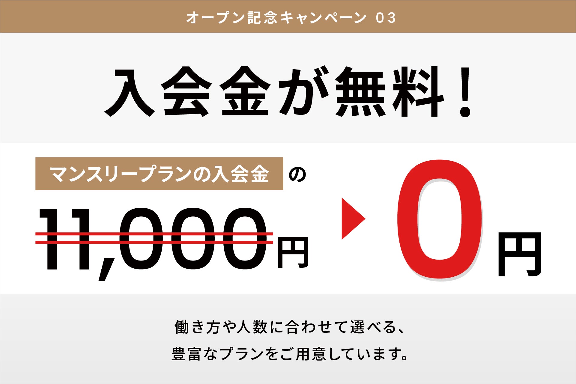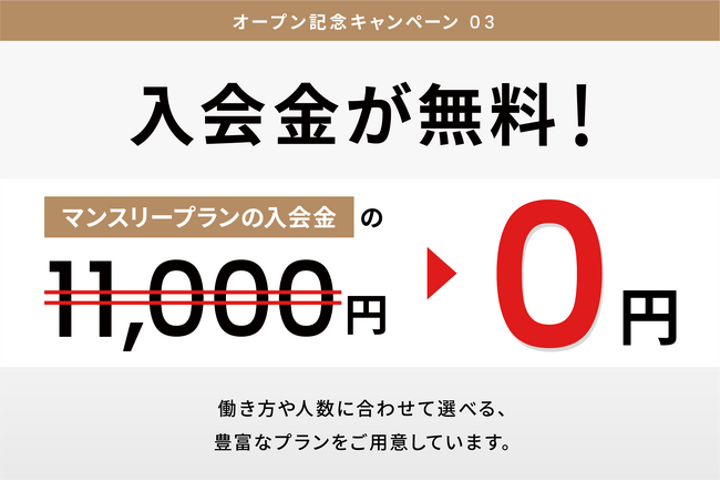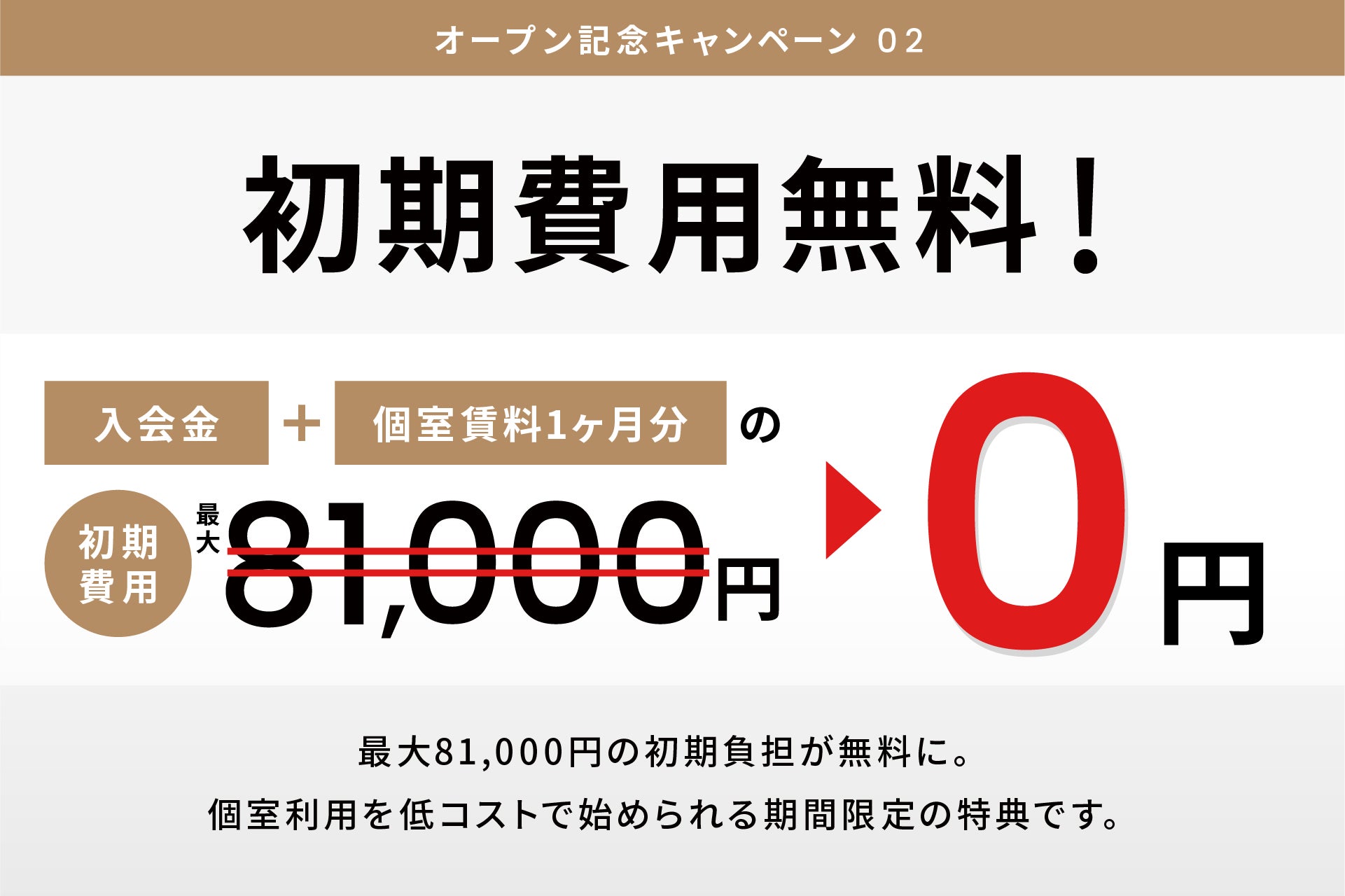 個室契約の費用が大幅にお得になる特別キャンペーンです。通常11,000円の入会金に加え、賃料1ヶ月分(最大70,000円)も無料となるため、最大81,000円の初期負担が無料に。個室利用を低コストで始められる期間限定の特典です。