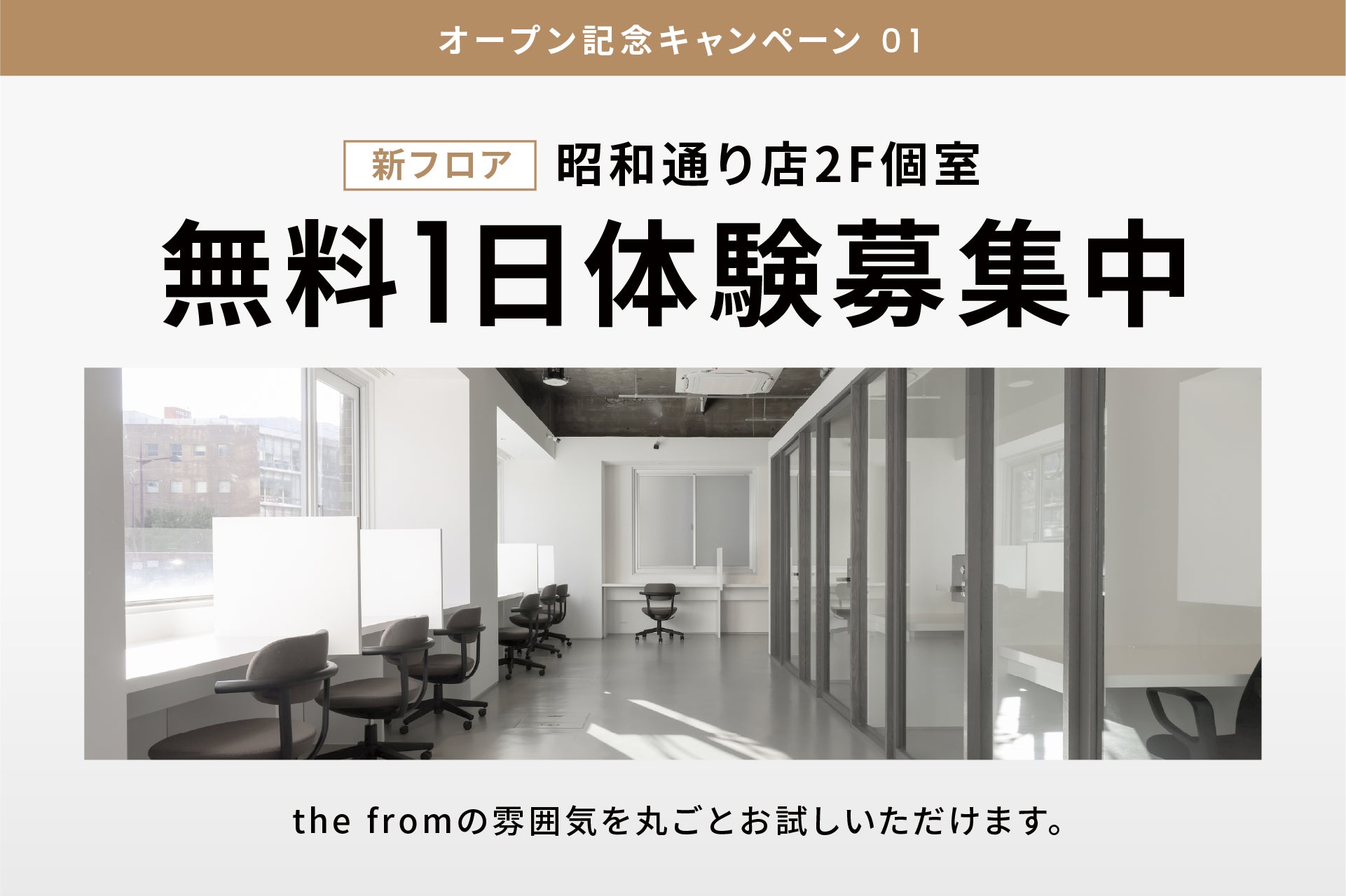 今年12月コワーキングスペース「the from 昭和通り店」がさらに進化。2Fフロアに個室席を新設し、フリーランスやスタートアップなど、仕事に深く没頭できる「自分だけのワークスペース」を提供します。