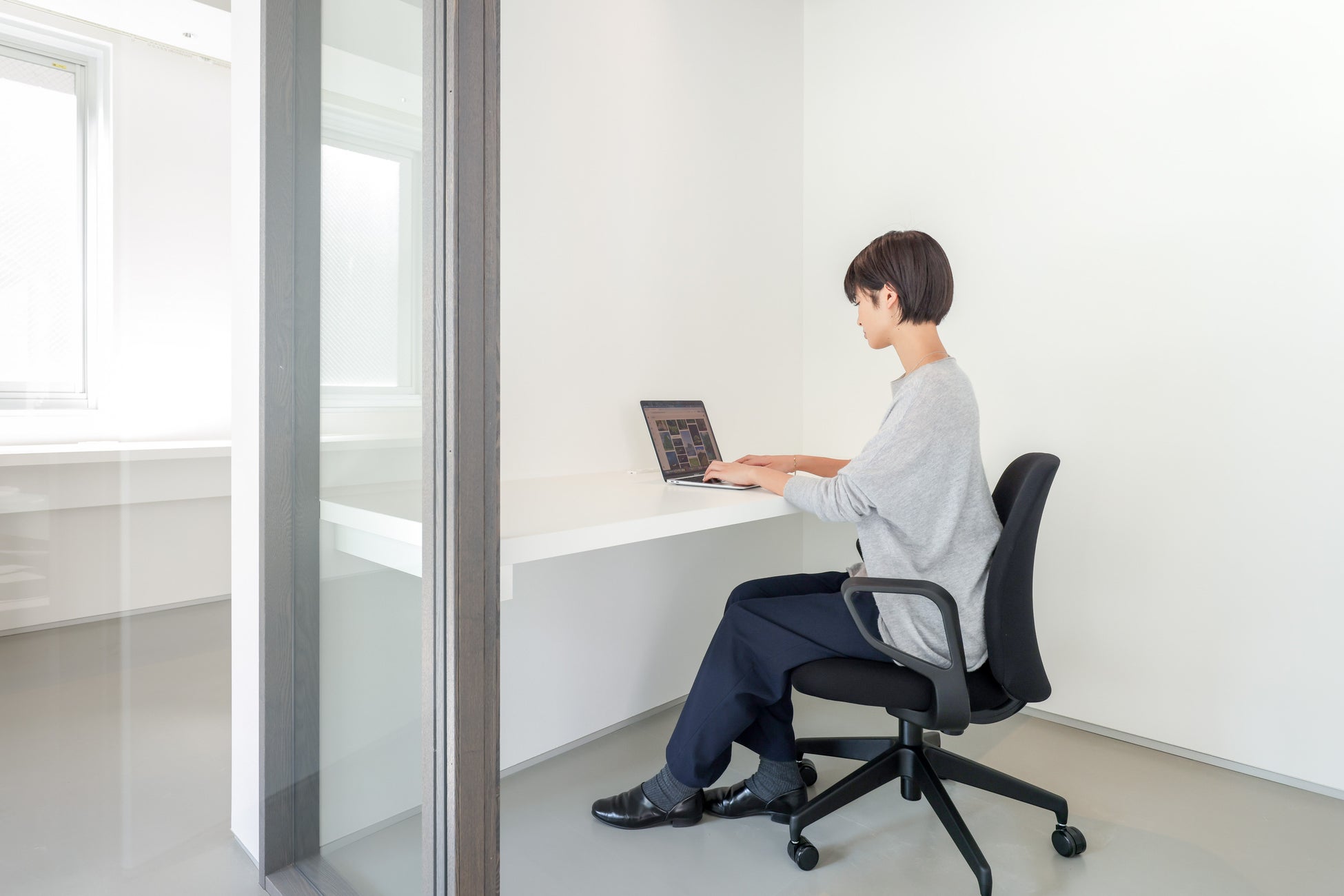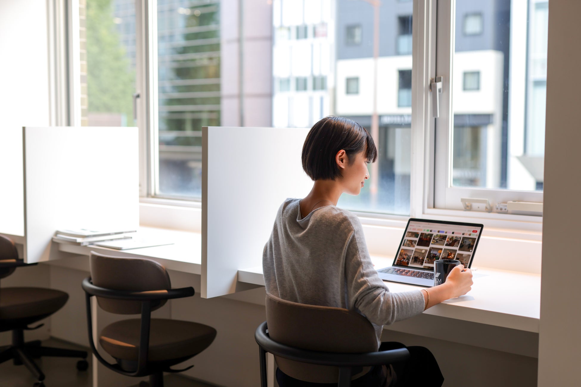 デスクはゆったりと使えるサイズで、PC作業はもちろん、書類を広げての作業もストレスなく行えます。電源も備え付けているため、長時間の作業でも安心。さらに、長く座っても疲れにくい椅子を採用し、ビジネスパーソンにもクリエイターにも満足いただける環境を整えました。