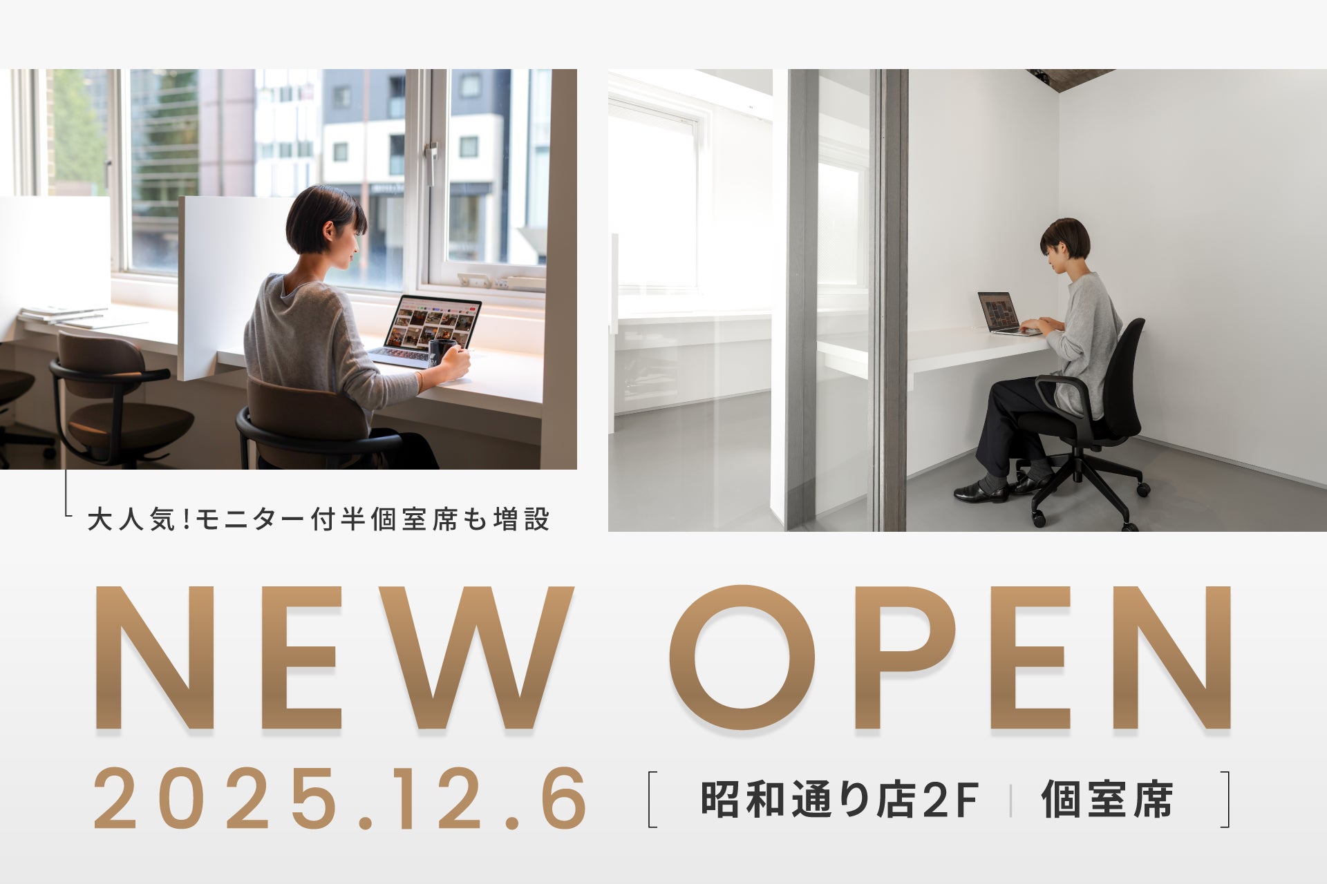 the from でも、これまで利用者の皆さまから「PCや書類などを置いておける個室環境がほしい」「起業初期でも負担なく使える拠点がほしい」「モニター付き半個室の席数を増やしてほしい」といった声を多くいただいてきました。こうしたお声に応える形で、2025年12月6日(土)より、2Fフロアを新たにオープンし、個室席の新設と半個室席の増設を行いました。