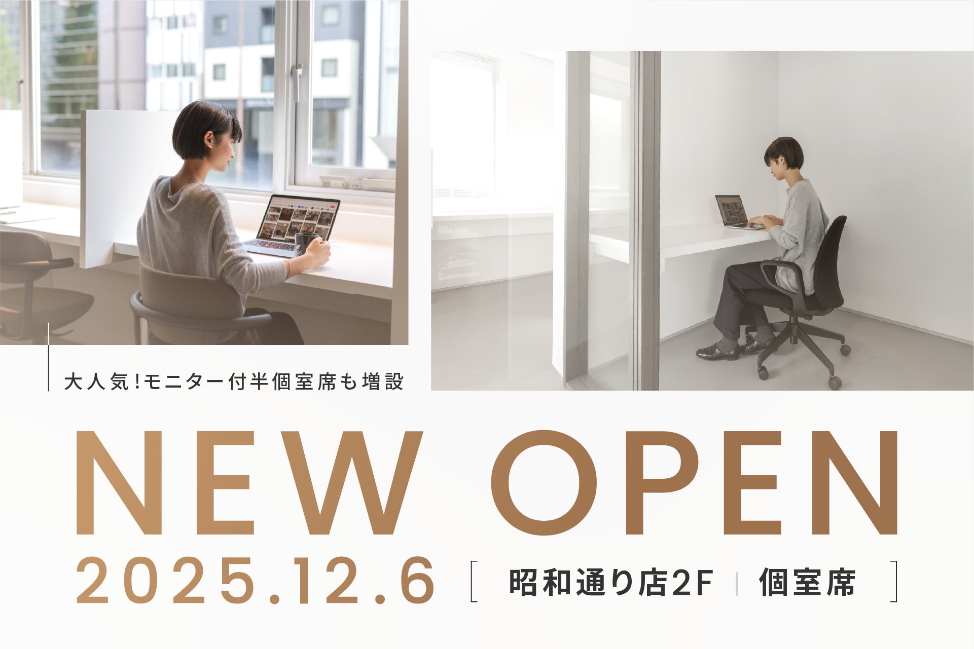 昭和通り店2Fのオープンを記念して、個室利用を始めやすくする特別なキャンペーンをご用意しました。初めての方から、フリーランス、スタートアップ、これから起業しようと考えている方まで、さまざまな働き方にフィットするお得な内容です。