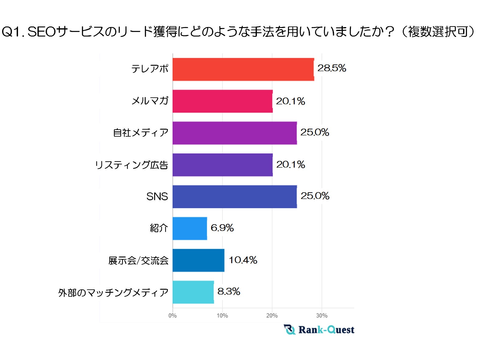 https://rank-quest.jp/column/column/how-to-seo/ SEO支援実績4300社を誇るランクエストがSEO支援会社で勤務経験がある144名にリード獲得実態を調査