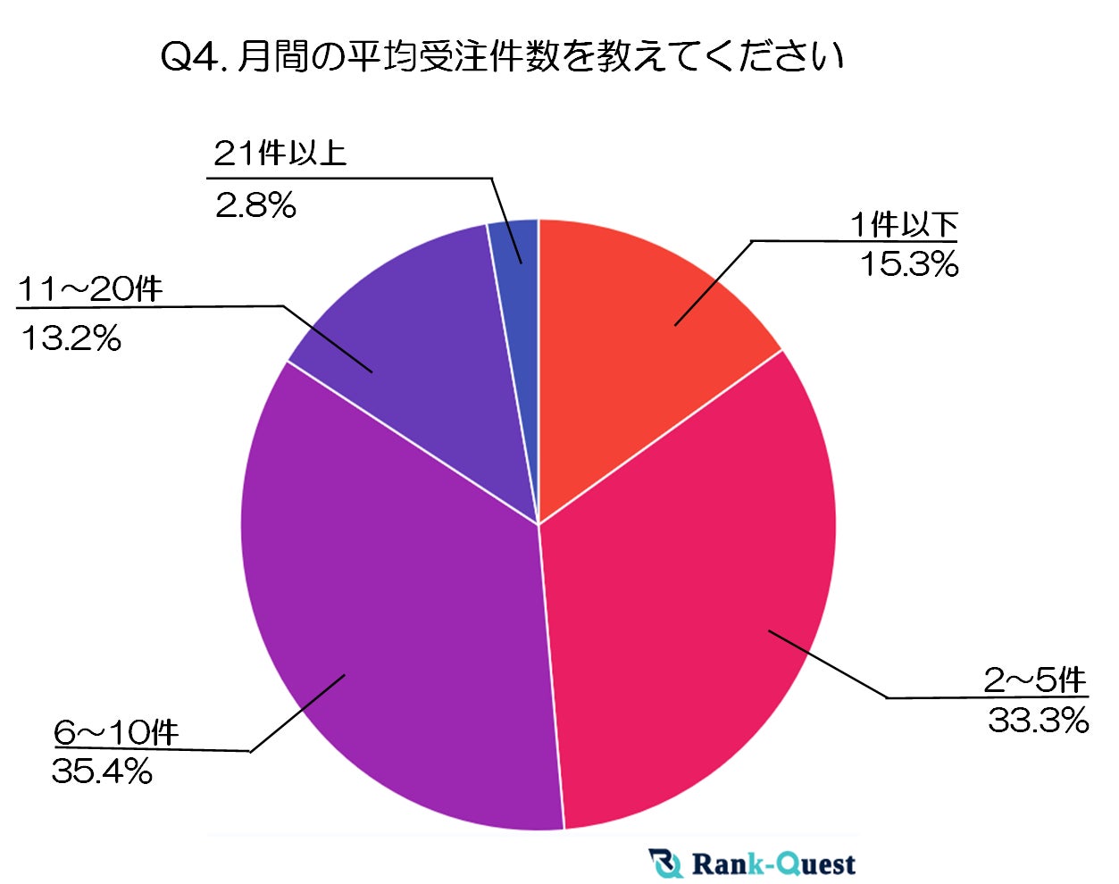 これらの結果から、月間平均受注件数が6〜10件に集中していることが分かります。一方で、2〜5件や1件以下の回答も多く、小規模な受注件数で推移している企業が一定数存在していると考えられます。