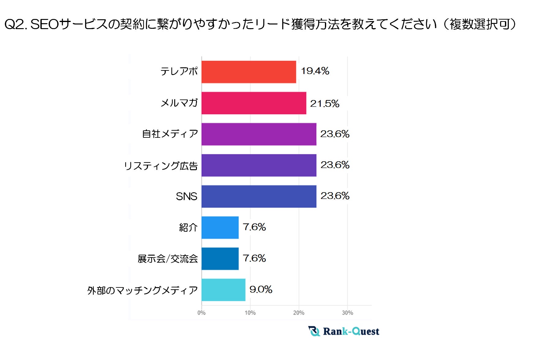 最も多かった回答は「自社メディア」「リスティング広告」「SNS」で、それぞれ23.6%が選ばれました。これらは、契約に繋がりやすいリード獲得手法として高い評価を得ています。