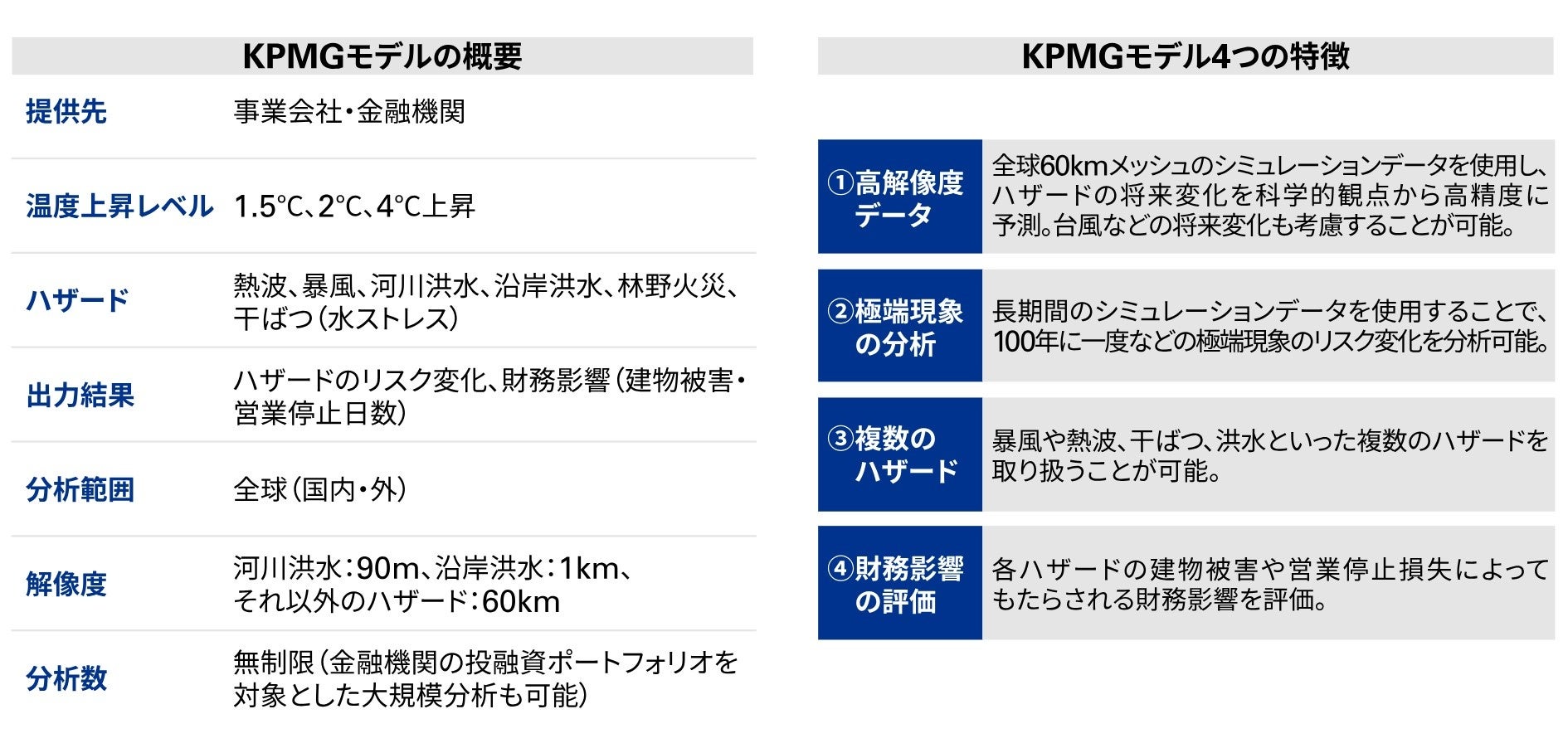 有限責任あずさ監査法人(東京都新宿区、理事長:山田 裕行)とKPMGあずさサステナビリティ株式会社(東京都千代田区、代表取締役: 斎藤 和彦、大槻 櫻子)は、経営判断をサポートする気候変動の物理的リスク分析モデル(以下、KPMGモデル)を開発し、このモデルを活用した新たな支援サービスの提供を開始しました。