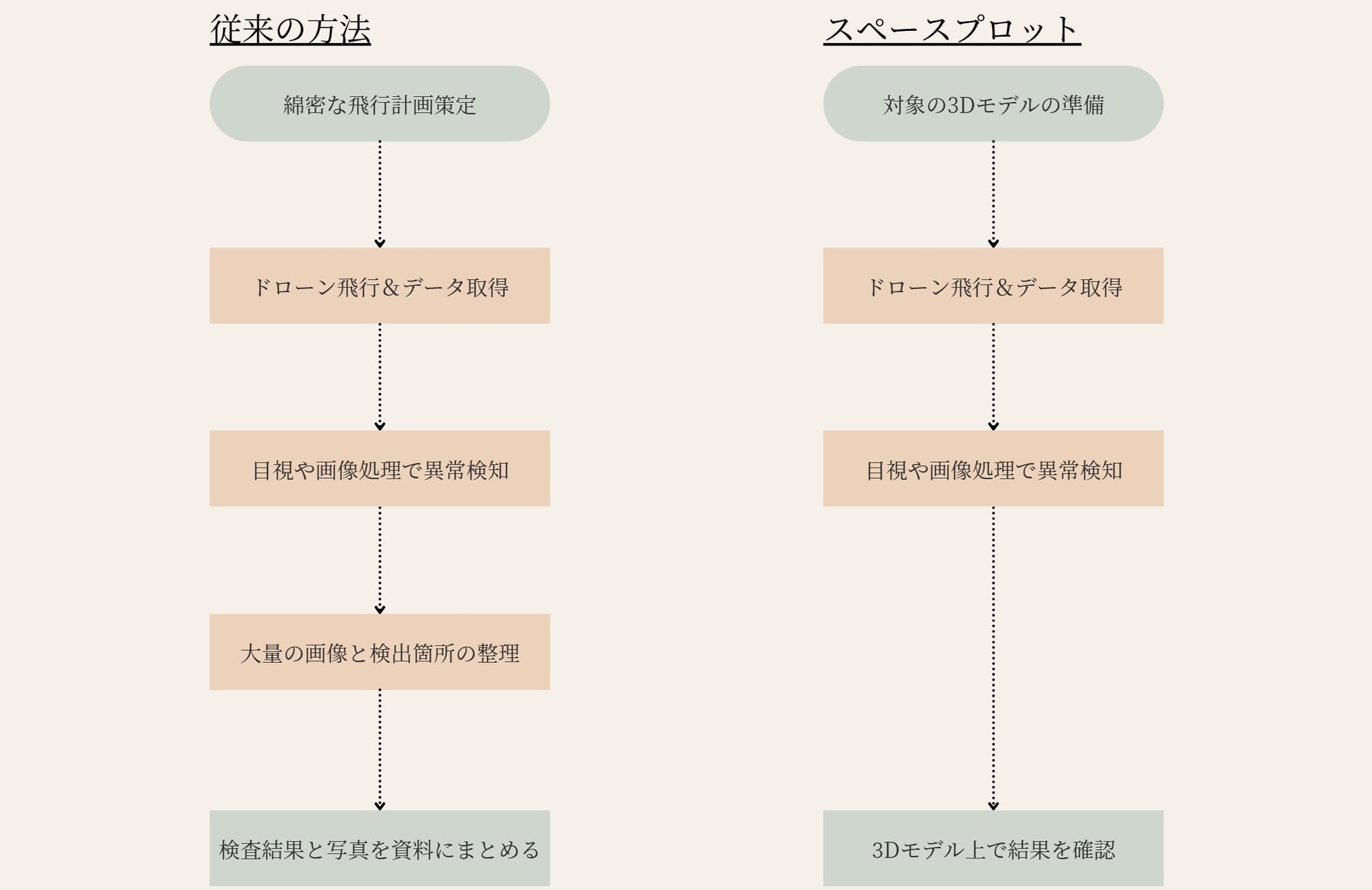 スペースプロットの地上での利用シーンとしては、ドローンを用いた大規模構造物の点検業務への活用などが考えられます。現在はドローン視点で撮影された画像から異常個所を検出する方法で検査が行われていますが、本技術を応用することで検査を3Dモデル上で一元管理することができると考えられます。