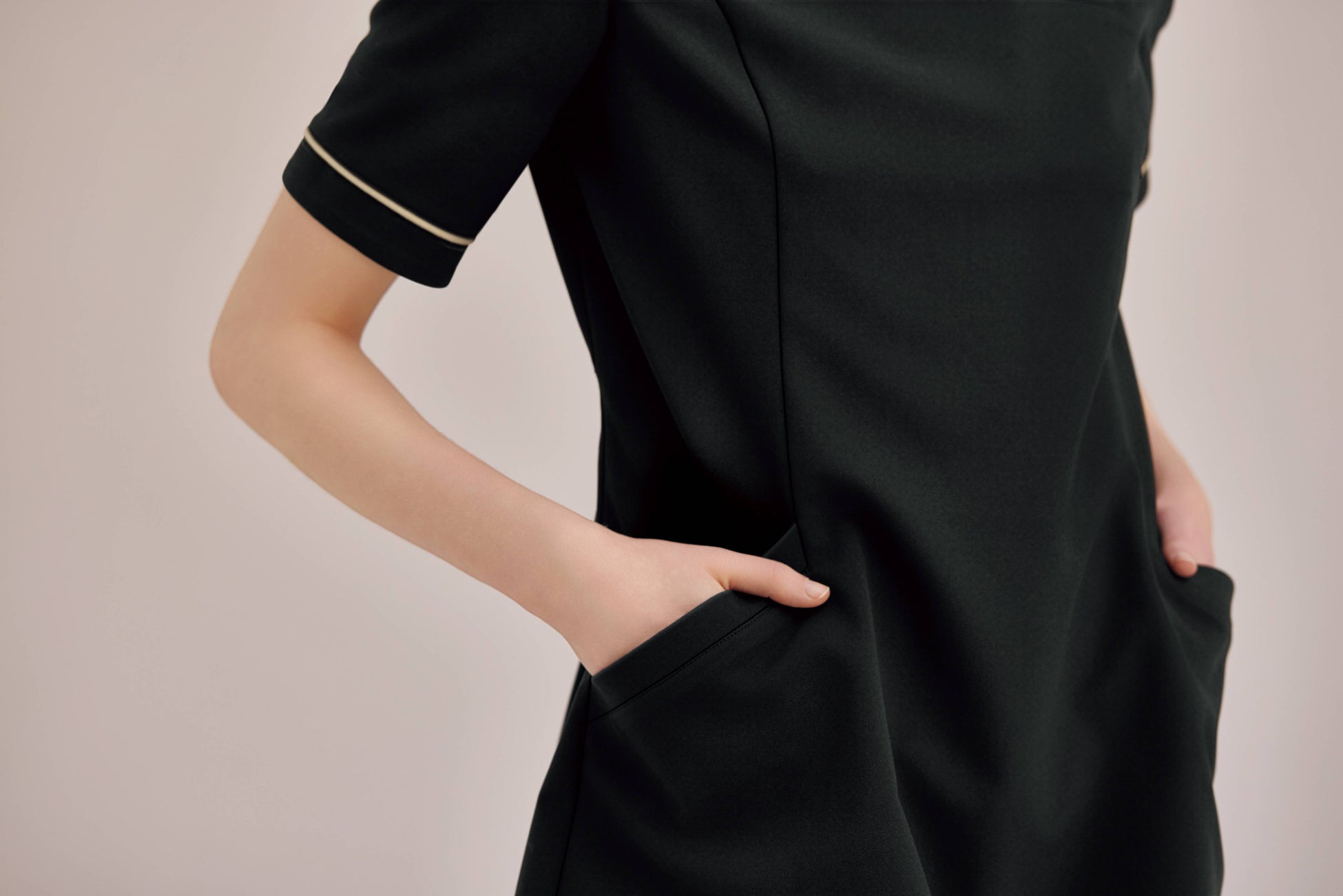 ・受付向け(ペプラム):座り仕事でもお腹を圧迫せず、座った姿も華やかなデザイン