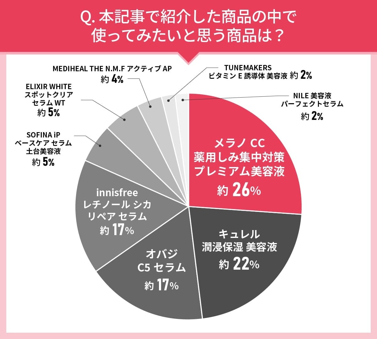 回答者にGranza Beautyの記事『40代・50代向け美容液おすすめ10商品をプロが厳選|選び方のポイントも解説』にある商品の中でどの商品を使ってみたいかを聞いてみました。ここでは『使ってみたい美容液のTOP5』を紹介します。