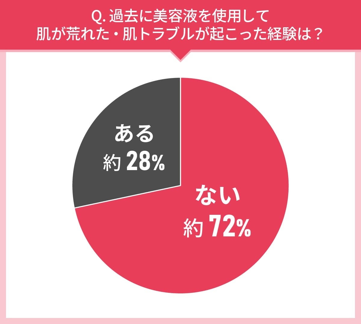 約72%の人が肌トラブルの経験はないと回答している一方で、約28%の人があると回答しました。少なからず合わない美容液を使うと肌トラブルが起こる場合があるということですね。