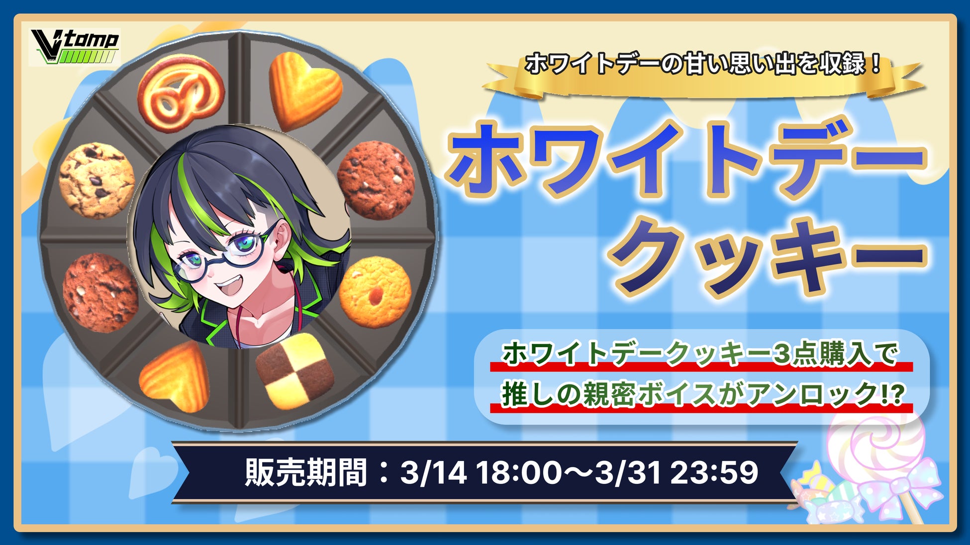 ホワイトデークッキーとは、ホワイトデーにぴったりなデジタルグッズで、「ホワイトデーの想い」をテーマにした各活動者のボイスを収録しています。本商品を3点購入すると、バレンタインの「親密版ボイス」がアンロックされる仕組みとなっており、よりファンの皆さんにお楽しみいただける内容となっています。※3