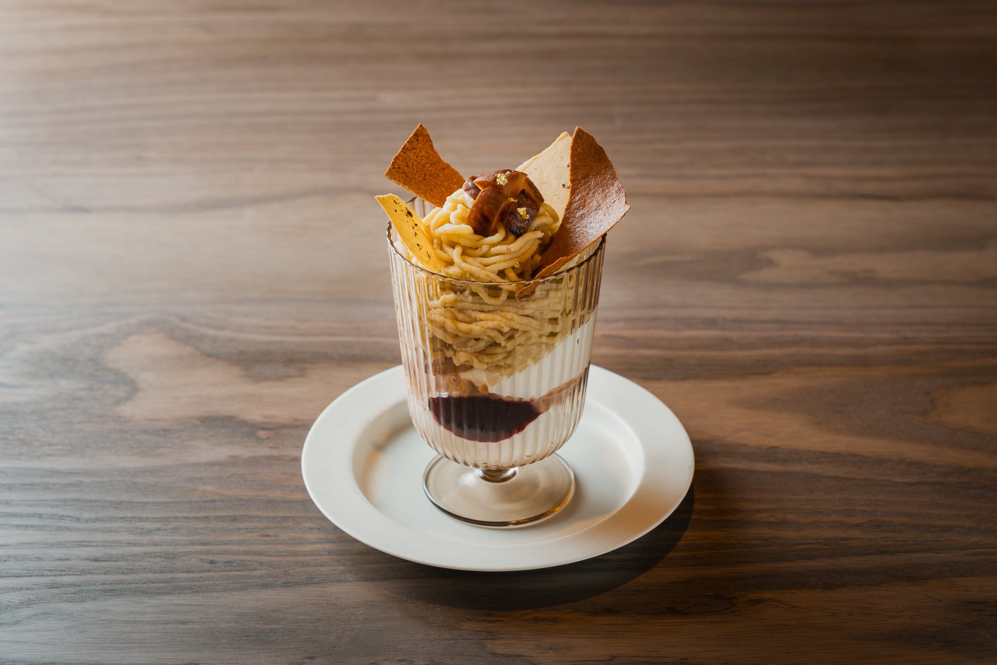 下段には、なめらかなクレームシャンティとカシスのピューレ。その上に、濃厚なショコラアイスとパートシュクレ ショコラ、和栗ペーストを練り込んだアイスを重ね、トップには、和栗クリームをたっぷりと絞り、渋皮煮、和栗のチュイルとショコラのチュイルを乗せました。 カシスの酸味とチョコレートのコク、そして和栗の豊かな香りが重なり合う、深みのある贅沢な一品です。