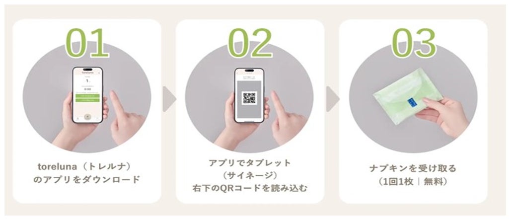 本サービスは、お客様が専用アプリをダウンロードし、トイレ個室内のQRコードを読み取るだけで生理用ナプキンが無料で受け取れるサービスとなっております。