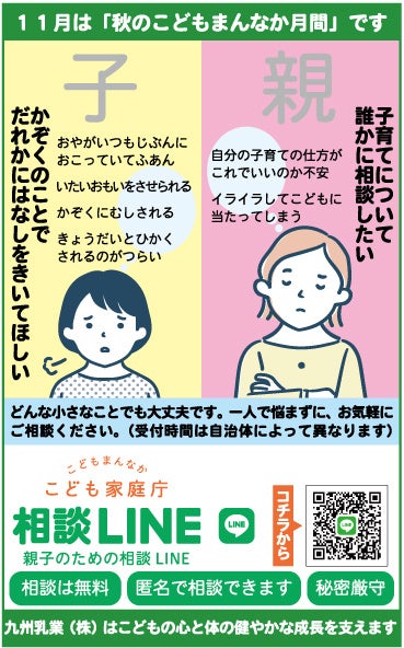“健康を作るみどり牛乳”を理念とする九州乳業は、この取り組みに賛同し、弊社の主力商品である“牛乳”を通してこどもたちの健やかな成長を支えながら、こどもを生み育てることに喜びを感じられる社会を目指して、今回、幅広い世代に普及しているコミュニケーションアプリ「LINE(ライン)」による全国共通の相談支援システム “親子のための相談LINE”についての広報を掲載することといたしました。生活のなかで生活者の目に触れる機会の多い牛乳パックの側面に『広報欄』を設け、「子育てや親子関係について悩んだときに、こども・若者、子育て当事者を始めとする様々な方々が相談できる窓口」の存在を広く社会に知っていただく取り組みを企業の社会貢献活動の一環として行います。尚、この取り組みは、2020年よりスタートし、今年で5年目となります。