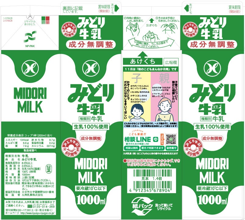 九州乳業「みどり牛乳」(1000ml)“親子のための相談LINE” 広報掲載のお知らせ