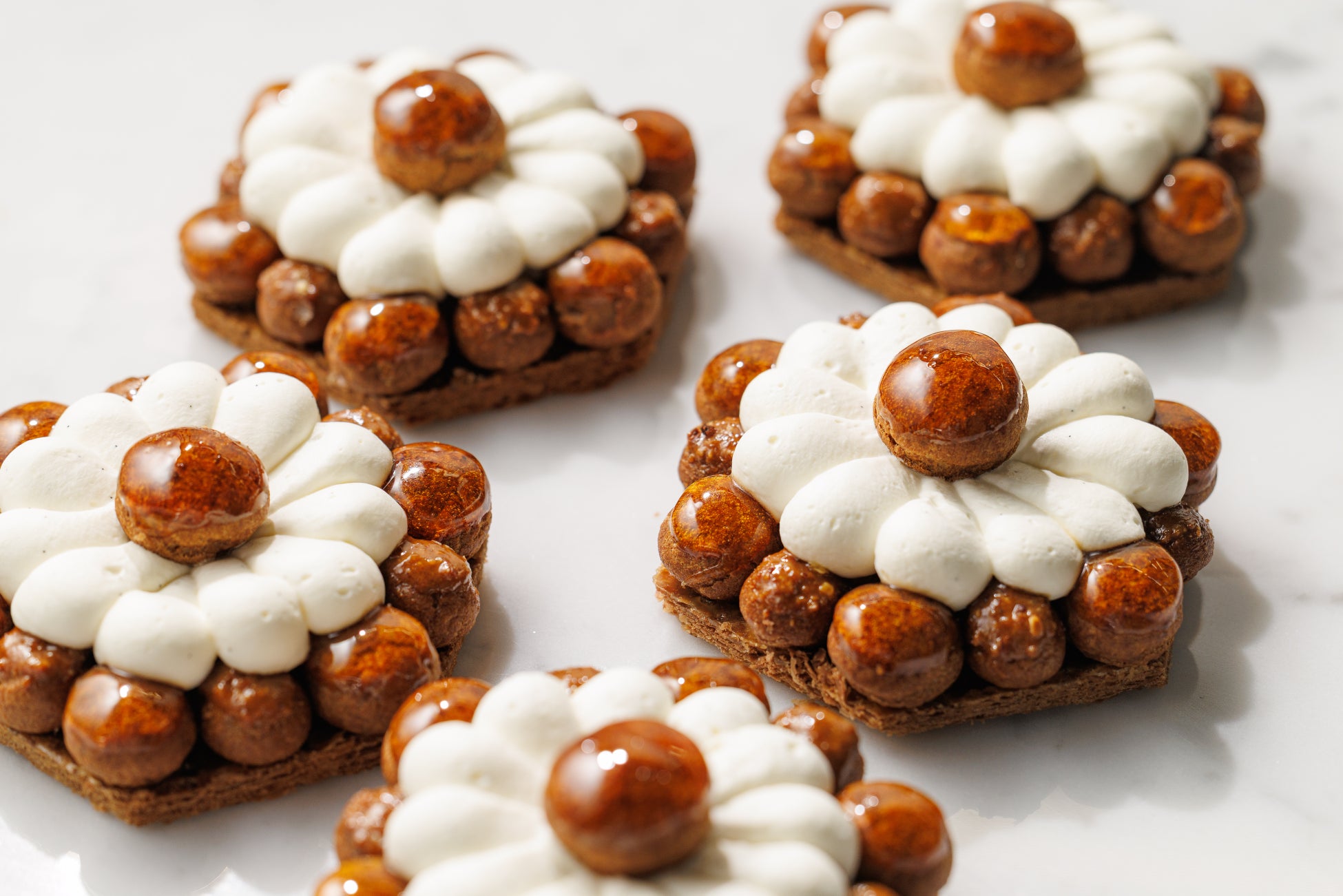 六角形に模ったショコラ風味のパイ生地の上に、小さなショコラのシューを並べ、その上にカカオ75%のショコラクリームと、ふんわりと軽いバニラ風味のクリームを美しく絞りました。シューには薄くキャラメリゼを施しており、中央と周りの大きめのシューにはショコラの濃厚なクリームが詰められています。サクッと香ばしく焼き上げたショコラ風味のシュー生地とクリーミーなくちどけに香り高いショコラの風味が広がります。