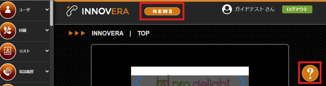 INNOVERA管理画面、中央上に【NEWS】ボタンが表示され、公式WEBページの「新機情報」「障害情報」「メンテナンス情報」の閲覧が2クリックで可能となりました。