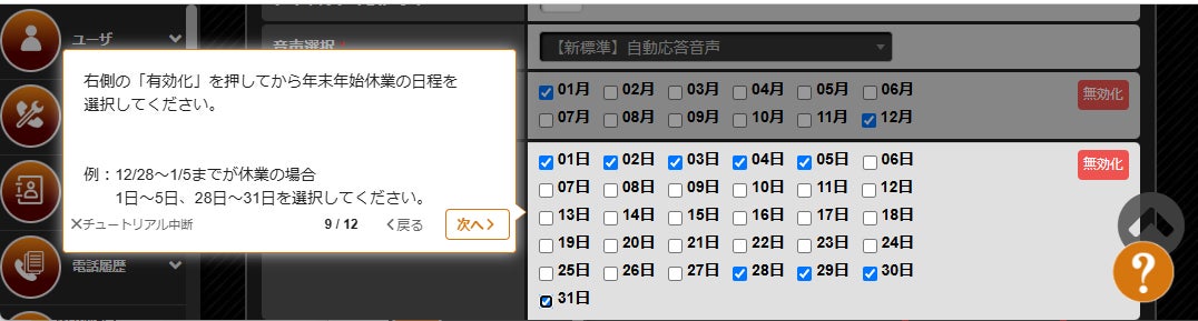 INNOVERAの管理画面、左下に【?】マークのチュートリアルボタンが新たに表示されました。このボタンから自動応答・転送・留守電の各機能の中から設定したいものを選ぶと実際の設定画面に遷移。それぞれの入力箇所に入力中は解説が表示され、入力方法や注意点を確認しながら設定が行えます。これにより、マニュアルを見なくてもより体感的に理解ができ、手軽にご利用いただけるようになりました。