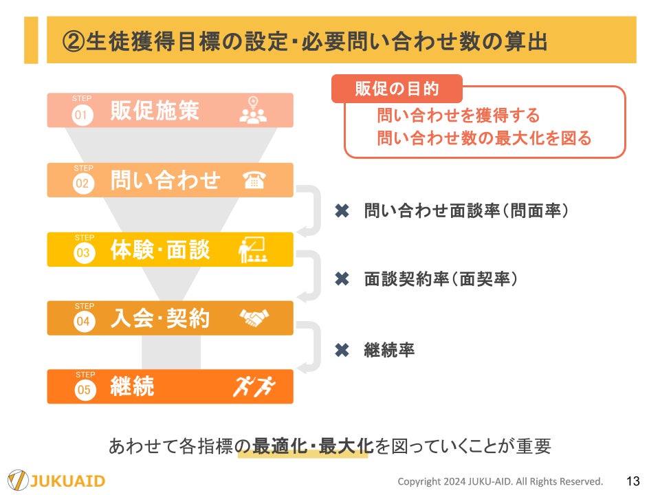 学習塾運営において、「入会者数」は最も重要な指標の一つです。入会者数を最大化するためには、「問い合わせ数」をいかに増やすかという点も大事ですが、一方で問い合わせ者をいかに面談・体験につなげられるか、面談・体験後にいかに入会につなげられるか、といった観点も必要です。一般に塾においては前者を『問面率(問体率)』、後者を『面契率(体契率)』と言います。