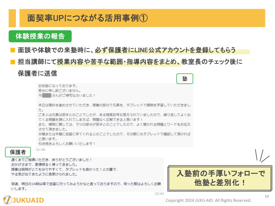 塾エイド主催にて、「LINE公式」を活用した保護者とのコミュニケーション手法、問合面率、面契率、継続率アップのための活用方法をご紹介いたしました。