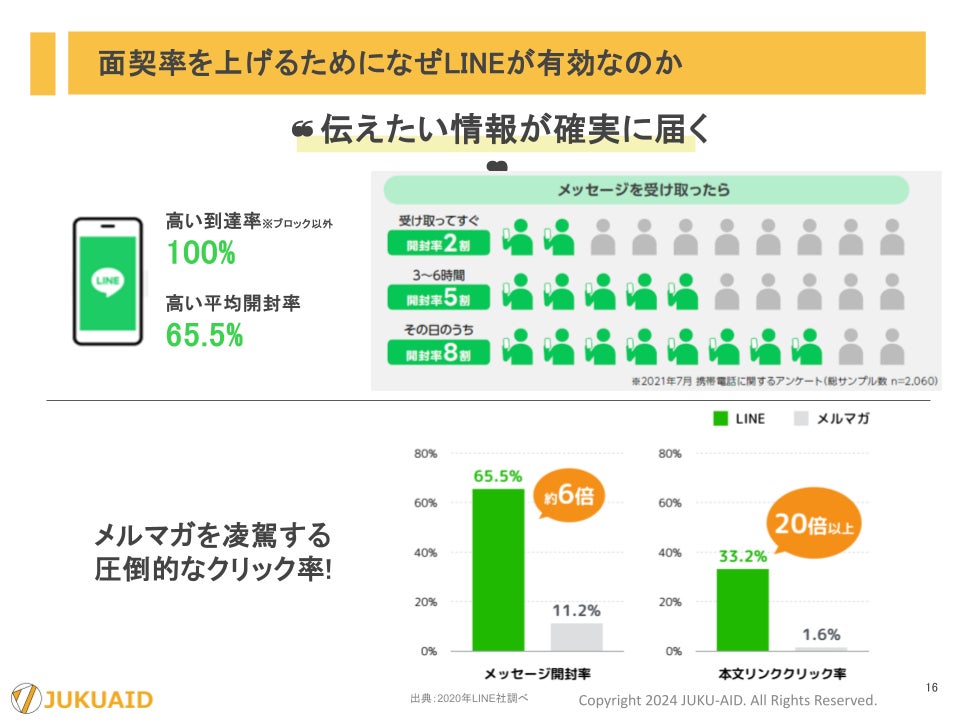 また、問面率・面契率アップにおいて、『LINE公式』での接点づくりが非常に有効です。LINE公式は1:1のチャットだけでなく、一部の方を対象としたメッセージ配信や、ステップ配信を実施できます。到達率の高いLINEだからこそ、伝えたい情報を確実に届けることができます。
