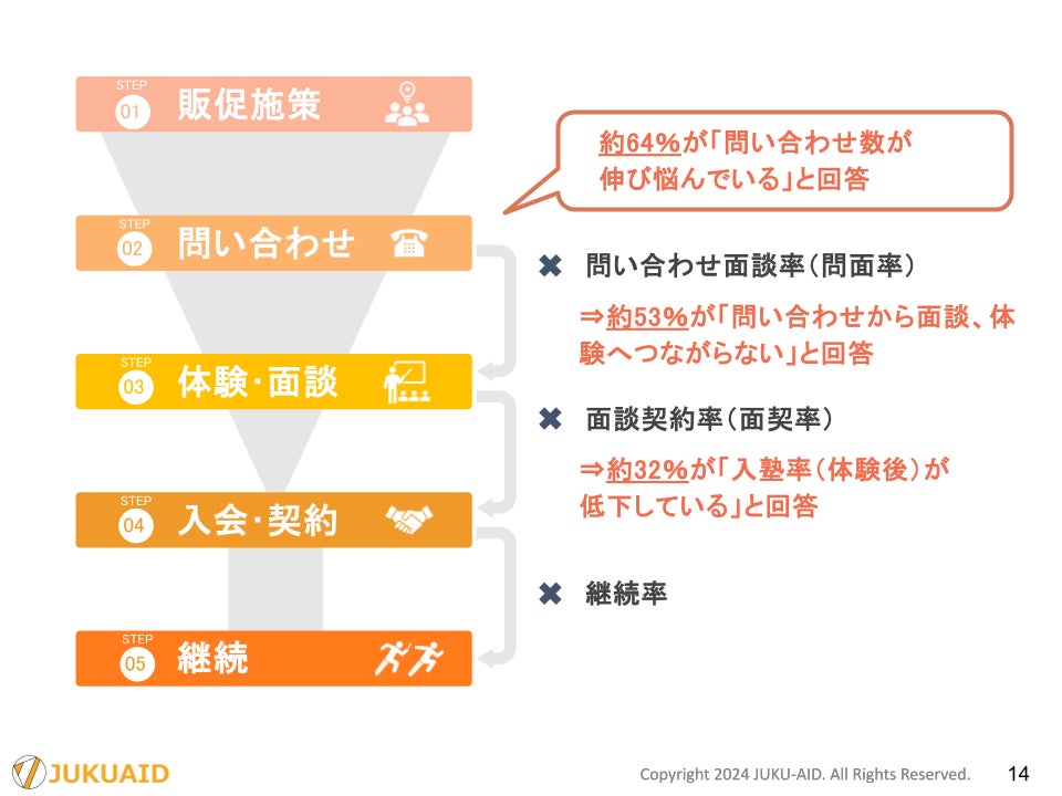 「塾の成功と学生の成長を両立させ、より広く価値を提供したい」という目的・志のもとに主体的に集まり、相互に協力して地域教育に貢献するための塾・スクール経営の組織である塾エイド(運営法人:株式会社インサイト・ジャパン、代表取締役社長: 鴨志田順)は、全国の学習塾経営者を対象とした「塾運営に関するお悩みアンケート」を実施いたしました。今回は、『問面率』『面契率』に関する結果についてお知らせいたします。