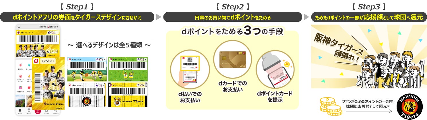 なお、本取組みは、「dポイントクラブ」アプリおよび「d払い」アプリからモバイルdポイントカードの券面を阪神タイガースのデザインにきせかえて、「dポイントカード」の提示、「d払い」でのお支払い、「dカード」でのお支払いのうちいずれかの方法でdポイントを貯めると、対象期間中にたまったdポイントの5%の金額を応援金とし、ドコモが阪神タイガースの応援広告出稿等を実施するものです。
