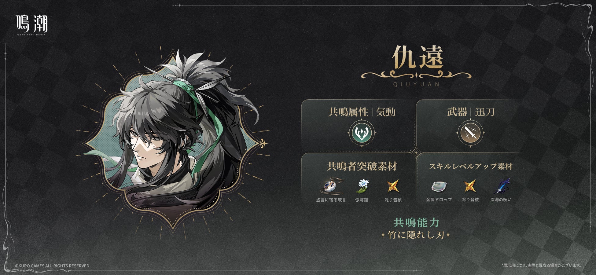仇遠は生まれつき目が見えないのですが、心のなかに具現化された“竹林”を通して外界を認識する特別な力を持っています。並外れた武芸の才を持っている仇遠は、幼い頃から師匠と共に山林で修行を積むことで、その能力は研ぎ澄まされています。仇遠は気動属性の星5共鳴者で、武器種は迅刀を使います。己の剣技に絶対的な自信を持つ仇遠の身のこなしは、卓越したもので敵を追い詰めていくことができるでしょう。